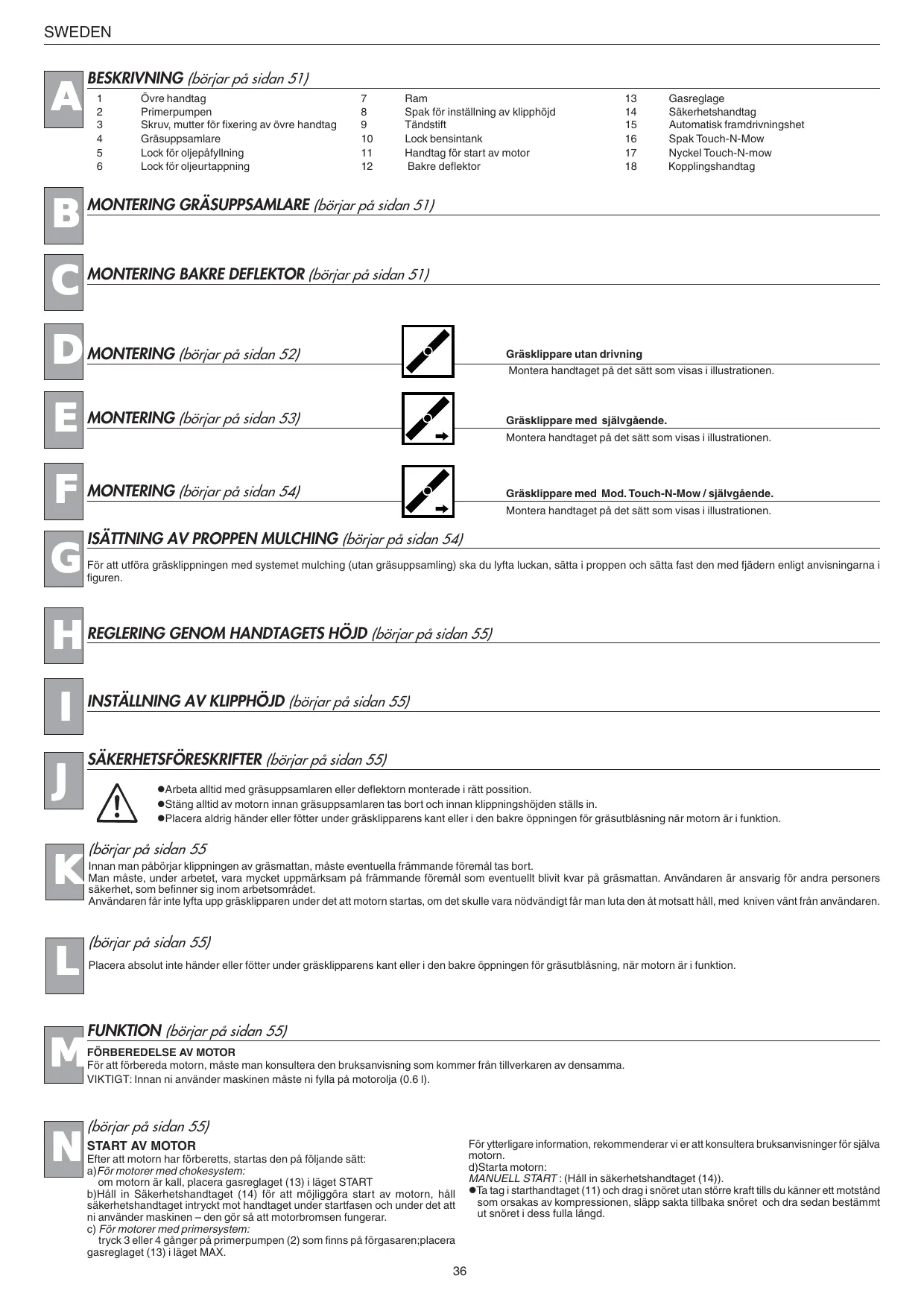Gasreglage Säkerhetshandtag Automatisk framdrivningshet Spak Touch-N-Mow Nyckel Touch-N-mow Kopplingshandtag Gräsklippare utan drivning Montera handtaget på det sätt som visas i illustrationen. Gräsklippare med självgående. Montera handtaget på det sätt som visas i illustrationen. Gräsklippare med Mod. Touch-N-Mow / självgående. Montera handtaget på det sätt som visas i illustrationen. ISÄTTNING AV PROPPEN MULCHING (börjar på sidan 54) För att utföra gräsklippningen med systemet mulching (utan gräsuppsamling) ska du lyfta luckan, sätta i proppen och sätta fast den med fjädern enligt anvisningarna i figuren. REGLERING GENOM HANDTAGETS HÖJD (börjar på sidan 55) INSTÄLLNING AV KLIPPHÖJD (börjar på sidan 55) SÄKERHETSFÖRESKRIFTER (börjar på sidan 55) lArbeta alltid med gräsuppsamlaren eller deflektorn monterade i rätt possition. lStäng alltid av motorn innan gräsuppsamlaren tas bort och innan klippningshöjden ställs in. lPlacera aldrig händer eller fötter under gräsklipparens kant eller i den bakre öppningen för gräsutblåsning när motorn är i funktion. (börjar på sidan 55 Innan man påbörjar klippningen av gräsmattan, måste eventuella främmande föremål tas bort. Man måste, under arbetet, vara mycket uppmärksam på främmande föremål som eventuellt blivit kvar på gräsmattan. Användaren är ansvarig för andra personers säkerhet, som befinner sig inom arbetsområdet. Användaren får inte lyfta upp gräsklipparen under det att motorn startas, om det skulle vara nödvändigt får man luta den åt motsatt håll, med kniven vänt från användaren. (börjar på sidan 55) Placera absolut inte händer eller fötter under gräsklipparens kant eller i den bakre öppningen för gräsutblåsning, när motorn är i funktion. FUNKTION (börjar på sidan 55)