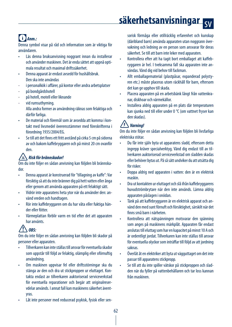 Le non-respect de ces recommandations peut entraîner un risque de brûlures. • Cet appareil est conçu pour faire du café: les projections d’eau et de vapeur ou une mauvaise utilisation de l’appareil peuvent provoquer des brûlures. • Pendant l’utilisation ne pas toucher les surfaces chaudes de l’appareil. Utiliser les poignées ou les manches. • Ne pas toucher l’appareil les mains ou les pieds mouillés ou humides. • La plaque chauffante reste chaude après l’utilisation de l’appareil. Attention! Le non-respect de ces recommandations peut entraîner des blessures ou des dommages à l’appareil. • Le fabricant ne peut être tenu pour responsable des dommages dus à une utilisation anormale, non conforme ou déraisonnable. • En cas de panne ou de mauvais fonctionnement éteignez l’appareil et débranchez la fiche de la prise. Pour toute réparation, adressez-vous exclusivement à un Centre de service agréé par le Fabricant et exigez des pièces détachées d’origine. Le non-respect de ces recommandations peut compromettre la sécurité de l’appareil.