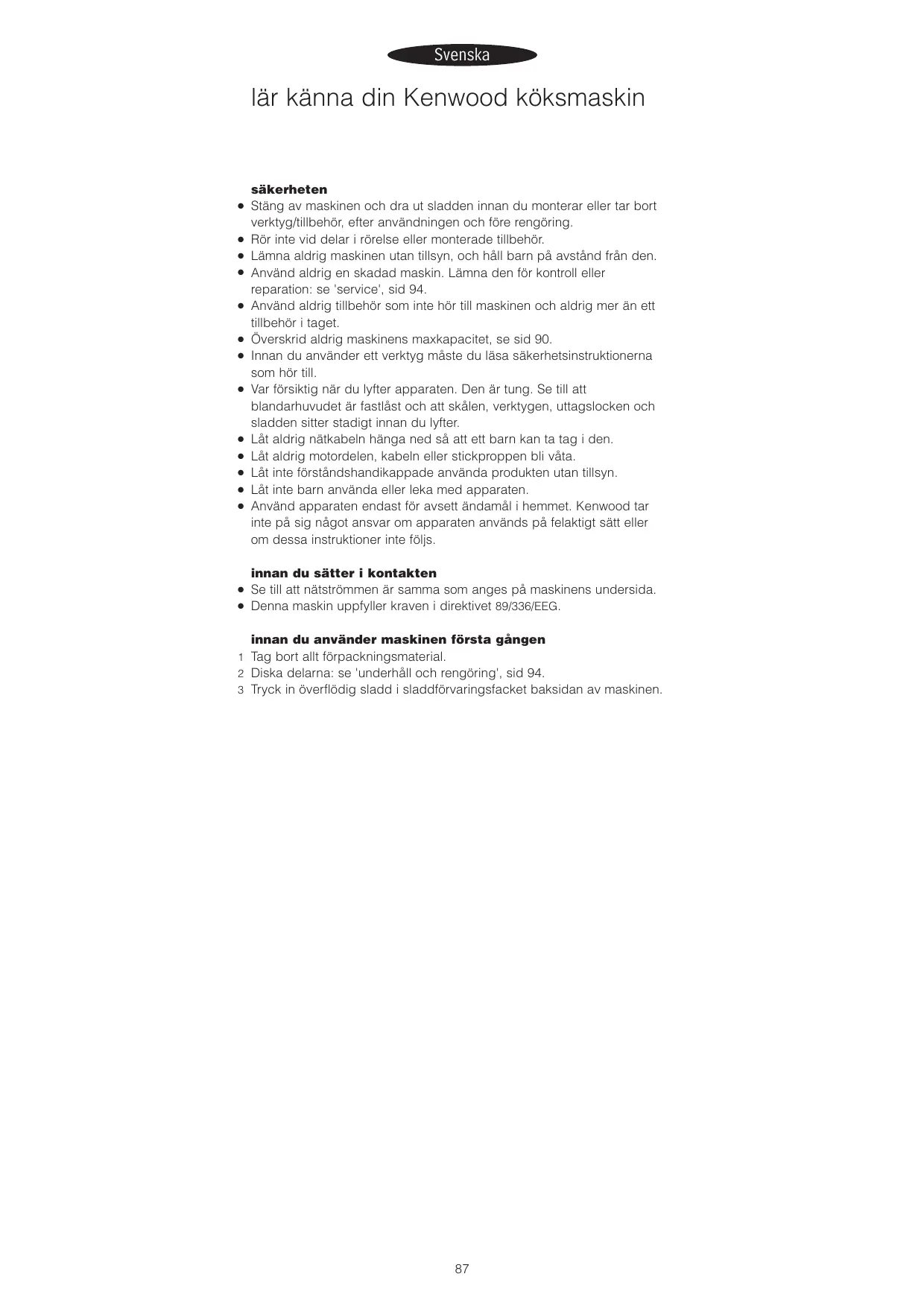 innan du sätter i kontakten Se till att nätstrômmen är samma som anges pà maskinens undersida. Denna maskin uppfyller kraven i direktivet 89/336/EEG.