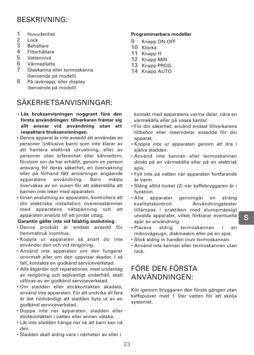 kontakt med apparatens varma delar, nära en värmekälla eller på vassa kanter. • För din säkerhet, använd endast tillverkarens tillbehör eller reservdelar avsedda för din apparat. • Koppla inte ur apparaten genom att dra i själva sladden. • Använd inte kannan eller termoskannan direkt på en värmekälla eller på en elektrisk spis. • Fyll inte på vatten när apparaten fortfarande är varm. • Stäng alltid locket (2) när kaffebryggaren är i funktion. • Alla apparater genomgår en sträng kvalitetskontroll. Användningstester tillämpas i praktiken med slumpmässigt utvalda apparater, vilket förklarar eventuella spår av användning. • Placera aldrig termoskannan i en mikrovågsugn, diskmaskin eller på en spis. • Stick aldrig in handen inuti termoskannan. • Använd inte kannan eller termoskannan utan lock.