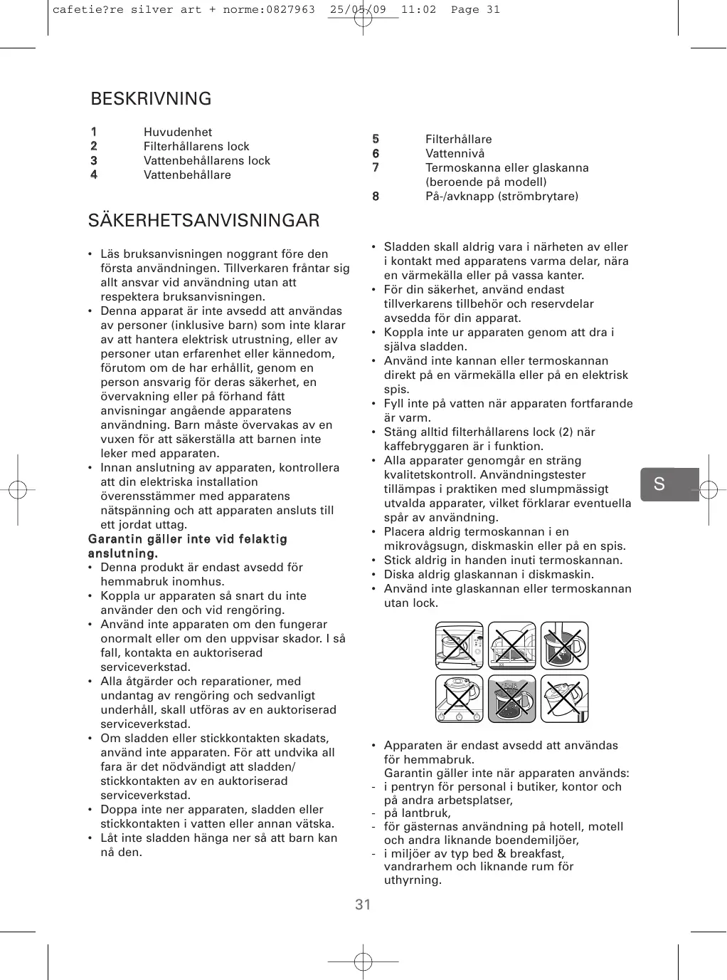 SÄKERHETSANVISNINGAR • Sladden skall aldrig vara i närheten av eller i kontakt med apparatens varma delar, nära en värmekälla eller på vassa kanter. • För din säkerhet, använd endast tillverkarens tillbehör och reservdelar avsedda för din apparat. • Koppla inte ur apparaten genom att dra i själva sladden. • Använd inte kannan eller termoskannan direkt på en värmekälla eller på en elektrisk spis. • Fyll inte på vatten när apparaten fortfarande är varm. • Stäng alltid filterhållarens lock (2) när kaffebryggaren är i funktion. • Alla apparater genomgår en sträng kvalitetskontroll. Användningstester tillämpas i praktiken med slumpmässigt utvalda apparater, vilket förklarar eventuella spår av användning. • Placera aldrig termoskannan i en mikrovågsugn, diskmaskin eller på en spis. • Stick aldrig in handen inuti termoskannan. • Diska aldrig glaskannan i diskmaskin. • Använd inte glaskannan eller termoskannan utan lock.