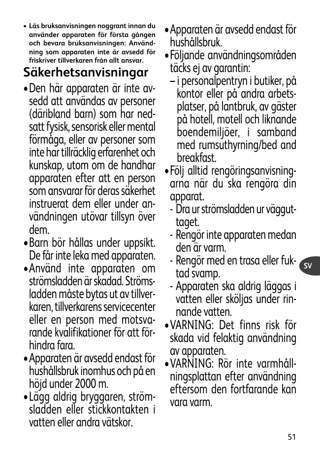 •Apparaten är avsedd endast för hushållsbruk. •Följande användningsområden täcks ej av garantin: – i personalpentryn i butiker, på kontor eller på andra arbetsplatser, på lantbruk, av gäster på hotell, motell och liknande boendemiljöer, i samband med rumsuthyrning/bed and breakfast. •Följ alltid rengöringsanvisningarna när du ska rengöra din apparat. - Dra ur strömsladden ur vägguttaget. - Rengör inte apparaten medan den är varm. - Rengör med en trasa eller fuktad svamp. - Apparaten ska aldrig läggas i vatten eller sköljas under rinnande vatten. •VARNING: Det finns risk för skada vid felaktig användning av apparaten. •VARNING: Rör inte varmhållningsplattan efter användning eftersom den fortfarande kan vara varm. 51