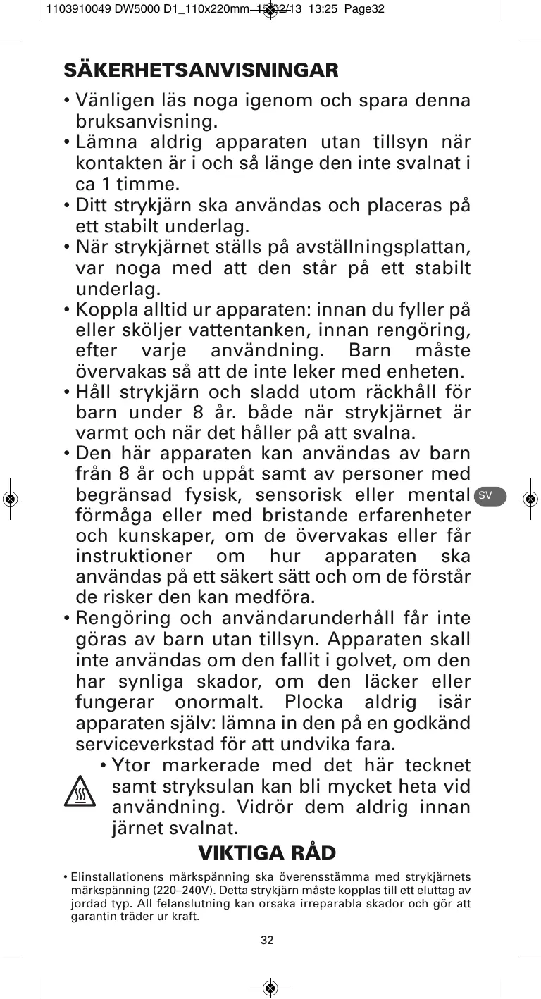 + Vänligen läs noga igenom och spara denna bruksanvisning. +-Lämna aldrig apparaten utan tillsyn när kontakten är i och sà länge den inte svalnat i ca 1 timme. - Ditt strykjärn ska användas och placeras pâ ett stabilt underlag. + När strykjärnet ställs pà avställningsplattan, var noga med att den stär pà ett stabilt underlag. Koppla alltid ur apparaten: innan du fyller pà eller skôljer vattentanken, innan rengôüring, efter varje användning. Barn mäste ôvervakas sà att de inte leker med enheten. Häll strykjärn och sladd utom räckhäll for barn under 8 är. bâde när strykjärnet àr varmt och när det häller pä att svalna. Den här apparaten kan användas av barn frän 8 àr och uppât samt av personer med begränsad fysisk, sensorisk eller mental @D « fôrmäga eller med bristande erfarenheter och kunskaper, om de ôüvervakas eller fàr instruktioner om hur apparaten ska användas pà ett säkert sätt och om de fôrstär de risker den kan medfüra. Rengôring och användarunderhäll fâr inte gôras av barn utan tillsyn. Apparaten skall inte användas om den fallit i golvet, om den har synliga skador, om den läcker eller fungerar onormalt. Plocka aldrig isär apparaten själv: lämna in den pà en godkänd serviceverkstad fôr att undvika fara. *Ytor markerade med det här tecknet À samt stryksulan kan bli mycket heta vid användning. Vidrôr dem aldrig innan järnet svalnat.
