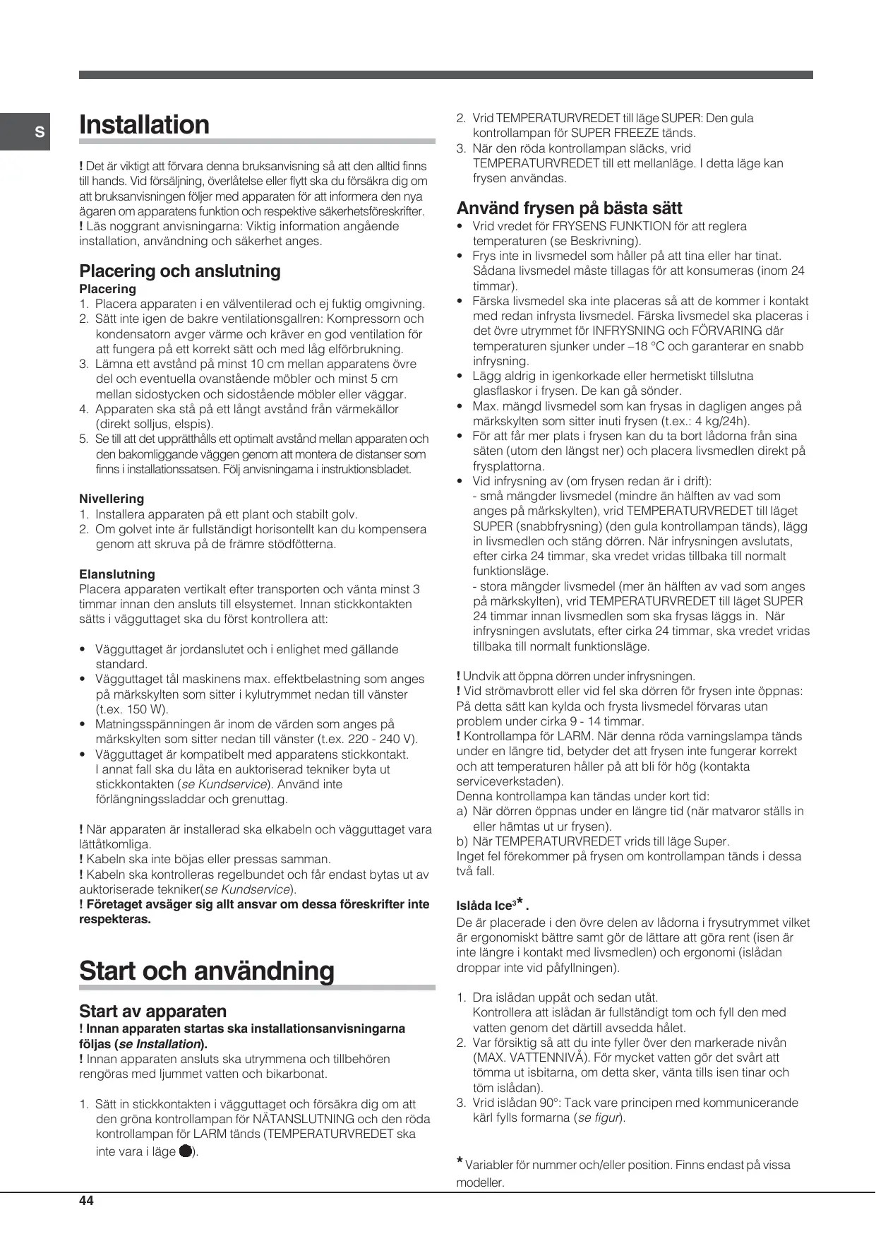 S Installation ! Det är viktigt att förvara denna bruksanvisning så att den alltid finns till hands. Vid försäljning, överlåtelse eller flytt ska du försäkra dig om att bruksanvisningen följer med apparaten för att informera den nya ägaren om apparatens funktion och respektive säkerhetsföreskrifter. ! Läs noggrant anvisningarna: Viktig information angående installation, användning och säkerhet anges.