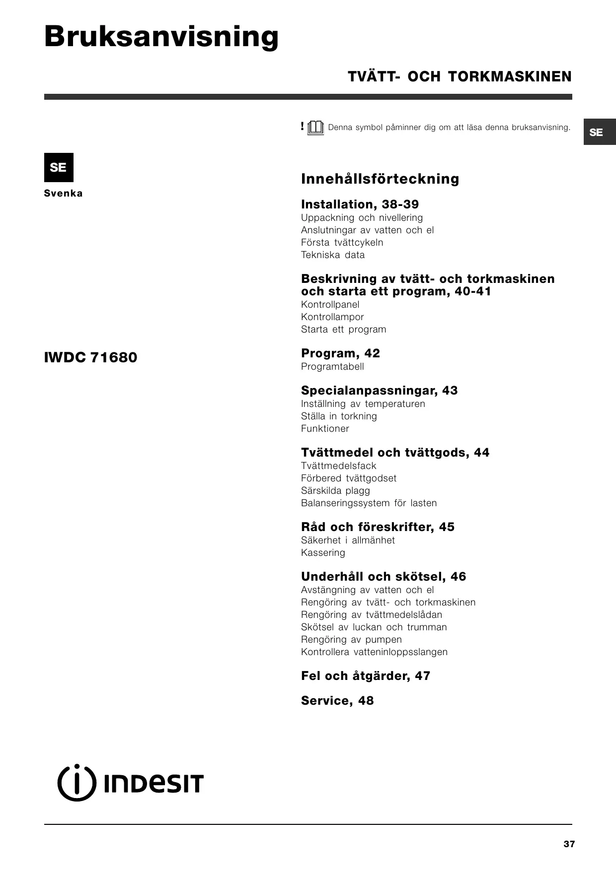 SE Det är viktigt att förvara denna bruksanvisning så att den alltid finns till hands. Vid försäljning, överlåtelse eller flytt ska du försäkra dig om att bruksanvisningen förblir tillsammans med tvätt- och torkmaskinen så att den nye ägaren kan ta del av dess information och varningar. Läs noggrant anvisningarna: Det finns viktig information angående installation, användning och säkerhet.
