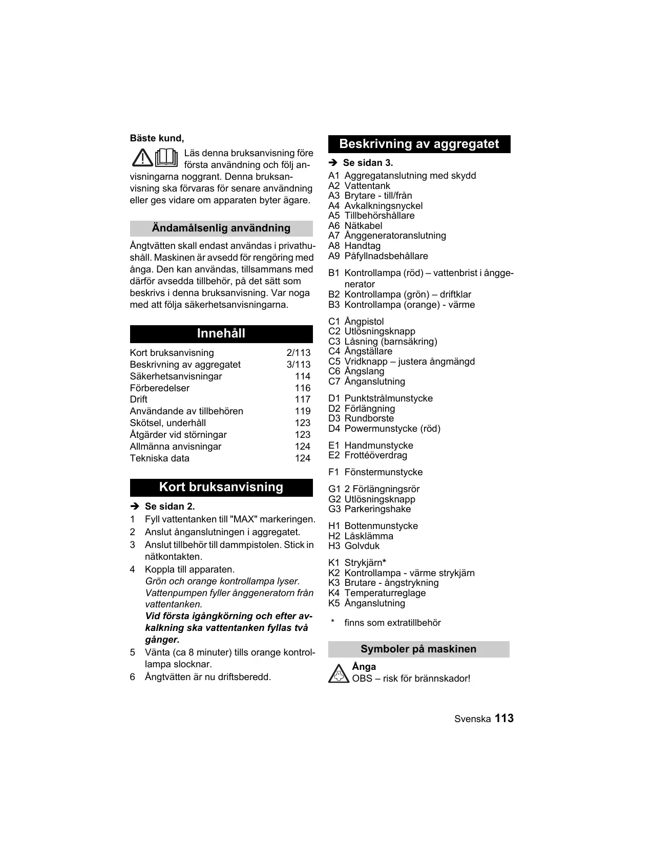 Bäste kund, ÂA Läs denna bruksanvisning fôre fôrsta användning och fôlj an- visningarna noggrant. Denna bruksan- visning ska fürvaras fôr senare användning eller ges vidare om apparaten byter ägare. Ândamälsenlig användning Angtvätten skall endast användas i privathu- shäll. Maskinen är avsedd für rengôüring med änga. Den kan användas, tillsammans med därfr avsedda tillbehôr, pà det sätt som beskrivs i denna bruksanvisning. Var noga med att fülja säkerhetsanvisningarna. Kort bruksanvisning 21113 Beskrivning av aggregatet 3/113 Säkerhetsanvisningar 114 Fôrberedelser 116 Drift 117 Användande av tillbehôren 119 Skôtsel, underhäll 123 Atgärder vid stôrningar 123 Allmänna anvisningar 124 Tekniska data 124 Kort bruksanvisn > Se sidan 2. 1 Fyllvattentanken till "MAX" markeringen. 2 Anslut änganslutningen i aggregatet. 3 Ansluttillbehôr till dammpistolen. Stick in nätkontakten. Koppla till apparaten. Grôn och orange kontrollampa lyser. Vattenpumpen fyller änggeneratorn frân vattentanken. Vid fôrsta igängkôrning och efter av- kalkning ska vattentanken fyllas tvà gänger. 5 Vänta (ca 8 minuter) tills orange kontrol- lampa slocknar. 6 Angtvätten är nu driftsberedd.
