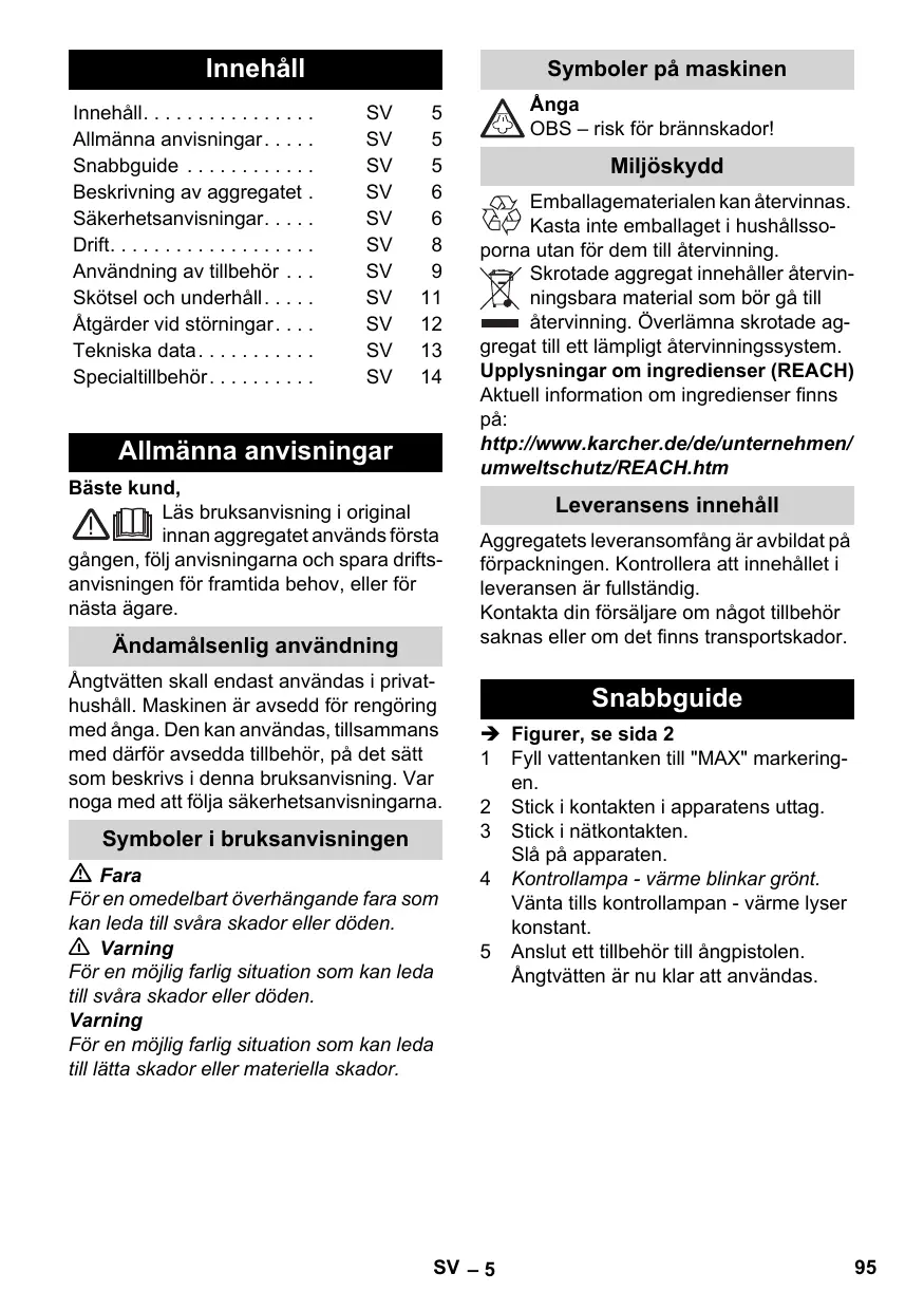 Allmänna anvisningar Bäste kund, Läs bruksanvisning i original innan aggregatet används första gången, följ anvisningarna och spara driftsanvisningen för framtida behov, eller för nästa ägare. Ändamålsenlig användning Ångtvätten skall endast användas i privathushåll. Maskinen är avsedd för rengöring med ånga. Den kan användas, tillsammans med därför avsedda tillbehör, på det sätt som beskrivs i denna bruksanvisning. Var noga med att följa säkerhetsanvisningarna. Symboler i bruksanvisningen Fara För en omedelbart överhängande fara som kan leda till svåra skador eller döden. 몇 Varning För en möjlig farlig situation som kan leda till svåra skador eller döden. Varning För en möjlig farlig situation som kan leda till lätta skador eller materiella skador. Ånga OBS – risk för brännskador! Miljöskydd Emballagematerialen kan återvinnas. Kasta inte emballaget i hushållssoporna utan för dem till återvinning. Skrotade aggregat innehåller återvinningsbara material som bör gå till återvinning. Överlämna skrotade aggregat till ett lämpligt återvinningssystem. Upplysningar om ingredienser (REACH) Aktuell information om ingredienser finns på: http://www.karcher.de/de/unternehmen/ umweltschutz/REACH.htm Leveransens innehåll Aggregatets leveransomfång är avbildat på förpackningen. Kontrollera att innehållet i leveransen är fullständig. Kontakta din försäljare om något tillbehör saknas eller om det finns transportskador. Snabbguide Î Figurer, se sida 2 1 Fyll vattentanken till "MAX" markeringen. 2 Stick i kontakten i apparatens uttag. 3 Stick i nätkontakten. Slå på apparaten. 4 Kontrollampa - värme blinkar grönt. Vänta tills kontrollampan - värme lyser konstant. 5 Anslut ett tillbehör till ångpistolen. Ångtvätten är nu klar att användas. SV – 5