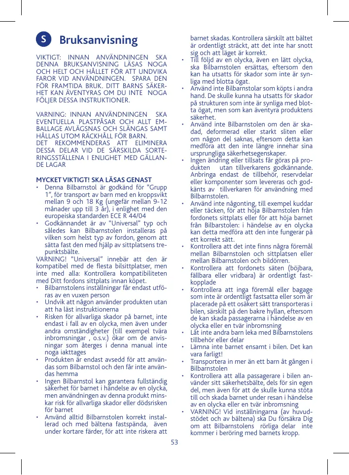 MYCKET VIKTIGT! SKA LÄSAS GENAST • Denna Bilbarnstol är godkänd för “Grupp 1”, för transport av barn med en kroppsvikt mellan 9 och 18 Kg (ungefär mellan 9-12 månader upp till 3 år), i enlighet med den europeiska standarden ECE R 44/04 • Godkännandet är av “Universal” typ och således kan Bilbarnstolen installeras på vilken som helst typ av fordon, genom att sätta fast den med hjälp av sittplatsens trepunktsbälte. VARNING! “Universal” innebär att den är kompatibel med de flesta bilsittplatser, men inte med alla: Kontrollera kompatibiliteten med Ditt fordons sittplats innan köpet. • Bilbarnstolens inställningar får endast utföras av en vuxen person • Undvik att någon använder produkten utan att ha läst instruktionerna • Risken för allvarliga skador på barnet, inte endast i fall av en olycka, men även under andra omständigheter (till exempel tvära inbromsningar , o.s.v.) ökar om de anvisningar som återges i denna manual inte noga iakttages • Produkten är endast avsedd för att användas som Bilbarnstol och den får inte användas hemma • Ingen Bilbarnstol kan garantera fullständig säkerhet för barnet i händelse av en olycka, men användningen av denna produkt minskar risk för allvarliga skador eller dödsrisken för barnet • Använd alltid Bilbarnstolen korrekt installerad och med bältena fastspända, även under kortare färder, för att inte riskera att