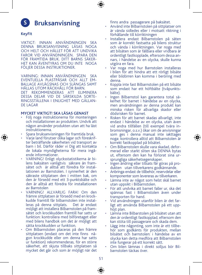 Le risque de blessures graves, et ce pas seulement en cas d'accident mais aus- si d'autres circonstances (ex. freinage brusque, etc.) augmente si on ne suit pas scrupuleusement es indications de ce ma- nuel : toujours s'assurer que le siège-auto soit correctement accroché au siège de la voiture
