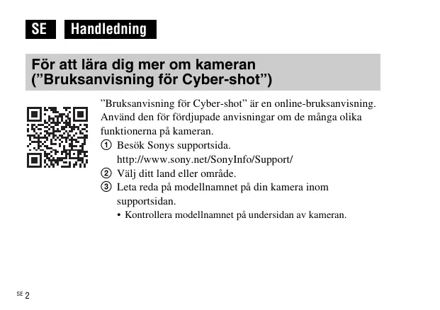 Handledning För att lära dig mer om kameran (”Bruksanvisning för Cyber-shot”) ”Bruksanvisning för Cyber-shot” är en online-bruksanvisning. Använd den för fördjupade anvisningar om de många olika funktionerna på kameran. 1 Besök Sonys supportsida. http://www.sony.net/SonyInfo/Support/ 2 Välj ditt land eller område. 3 Leta reda på modellnamnet på din kamera inom supportsidan.