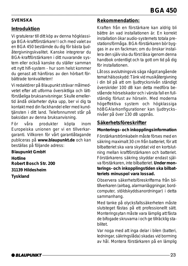 Vi gratulerar till ditt köp av denna högklassiga BGA-kraftförstärkare! I och med valet av en BGA 450 bestämde du dig för bästa ljudåtergivningskvalitet. Kanske integrerar du BGA-kraftförstärkaren i ditt nuvarande system eller också kanske du ställer samman ett nytt hifi-system - hur som helst kommer du genast att hänföras av den hörbart förbättrade tonkvaliteten! Vi redaktörer på Blaupunkt strävar målmedvetet efter att utforma översiktliga och lättförståeliga bruksanvisningar. Skulle emellertid ändå oklarheter dyka upp, ber vi dig ta kontakt med din fackhandel eller med kundtjänsten i ditt land. Telefonnumret står på baksidan av denna bruksanvisning. För våra produkter köpta inom Europeiska unionen ger vi en tillverkargaranti. Villkoren för vårt garantiåtagande publiceras på www.blaupunkt.de och kan beställas på följande adress: Blaupunkt GmbH Hotline Robert Bosch Str. 200 31139 Hildesheim Tyskland