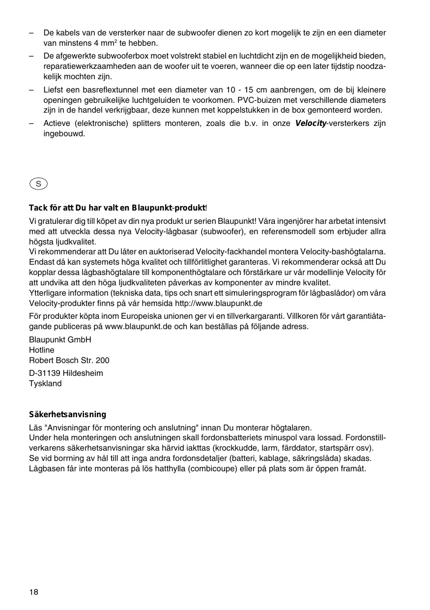 S Tack för att Du har valt en Blaupunkt-produkt! Vi gratulerar dig till köpet av din nya produkt ur serien Blaupunkt! Våra ingenjörer har arbetat intensivt med att utveckla dessa nya Velocity-lågbasar (subwoofer), en referensmodell som erbjuder allra högsta ljudkvalitet. Vi rekommenderar att Du låter en auktoriserad Velocity-fackhandel montera Velocity-bashögtalarna. Endast då kan systemets höga kvalitet och tillförlitlighet garanteras. Vi rekommenderar också att Du kopplar dessa lågbashögtalare till komponenthögtalare och förstärkare ur vår modellinje Velocity för att undvika att den höga ljudkvaliteten påverkas av komponenter av mindre kvalitet. Ytterligare information (tekniska data, tips och snart ett simuleringsprogram för lågbaslådor) om våra Velocity-produkter finns på vår hemsida http://www.blaupunkt.de För produkter köpta inom Europeiska unionen ger vi en tillverkargaranti. Villkoren för vårt garantiåtagande publiceras på www.blaupunkt.de och kan beställas på följande adress. Blaupunkt GmbH Hotline Robert Bosch Str. 200 D-31139 Hildesheim Tyskland
