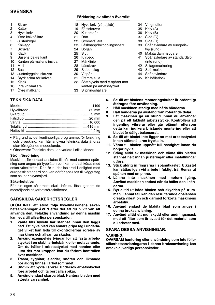 TEKNISKA DATA Modell 1100 Hyvelbredd 82 mm Skärdjup 3 mm Falsdjup 20 mm Varvtal 16 000 Totallängd 415 mm Nettovikt 4,9 kg • På grund av det kontinuerliga programmet för forskning och utveckling, kan här angivna tekniska data ändras utan föregående meddelande. • Observera: Tekniska data kan variera i olika länder. Strömförsörjning Maskinen får endast anslutas till nät med samma spänning som anges på typplåten och kan endast köras med enfas växelström. Den är dubbelisolerad i enlighet med europeisk standard och kan därför anslutas till vägguttag som saknar skyddsjord. Säkerhetstips För din egen säkerhets skull, bör du läsa igenom de medföljande säkerhetsföreskrifterna.