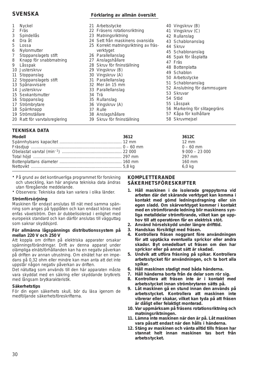 16. Var uppmärksam pà vikten av att använda fräs- verktyg som har korrekt skaftdiameter och är lämpliga fôr maskinens varvtal.