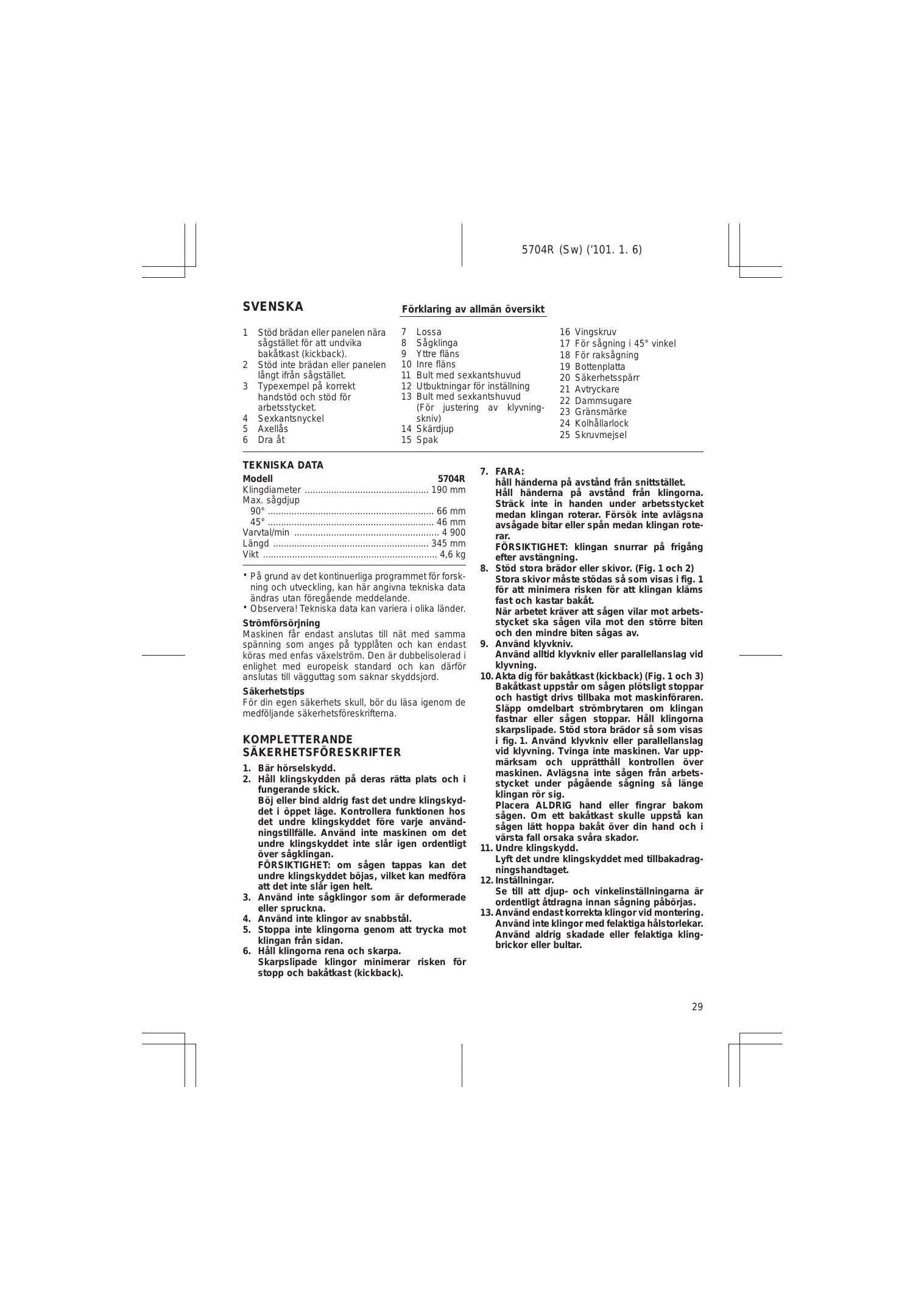 SVENSKA 1 Stédbrädanellerpanelennära 7 Lossa sägstället for att undvika 8 Sägklnga bakätkast (kickback) 9 Yttre fläns 2 Stôdinte brädan eller panelen 10 Inre fläns längt ifrän sägstället. 3 Typexempel pà korrekt handstôd och stôd fôr arbetsstycket 4 Sexkantsnyckel skniv) 5 Axells 14 Skärdjup 6 Draët 15 Spak 11 Bult med sexkantshuvud 12 Utbuktningar for inställning 13 Bult med sexkantshuvud {Fôr justering av klyvning- 5704R (Sw) (101. 1. 6) Fôrklaring av allmän ôversikt 16 Vingskruv 17 Fôr sägning i 45° vinkel 18 Fôr raksägning 19 Bottenplatta 20 Säkerhetsspärr 21 Aviyckare 22 Dammsugare 23 Gränsmärke 24 Kolhällariock 25 Skruvmejsel TEKNISKA DATA Modell Klingdiameter … Max. sägdjup 90° Längd Vikt + Pà grund av det kontinuerliga programmet fôr forsk- ning och utveckling, kan här angivna tekniska data ändras utan fôregäende meddelande. + Observera! Tekniska data kan variera i olika länder. Strémfôrsérining Maskinen fär endast anslutas til nèt med samma Spänning som anges pà typplâten och kan endast Kôras med enfas växelstrôm. Den är dubbelisolerad i enlighet med europeisk standard och kan därfôr anslutas til vâgguttag som saknar skyddsjord Säkerhetstips Fôr din egen säkerhets skull, bôr du läsa igenom de medfôljande säkerhetsfôreskrifterna KOMPLETTERANDE SAKERHETSFÔRESKRIFTER