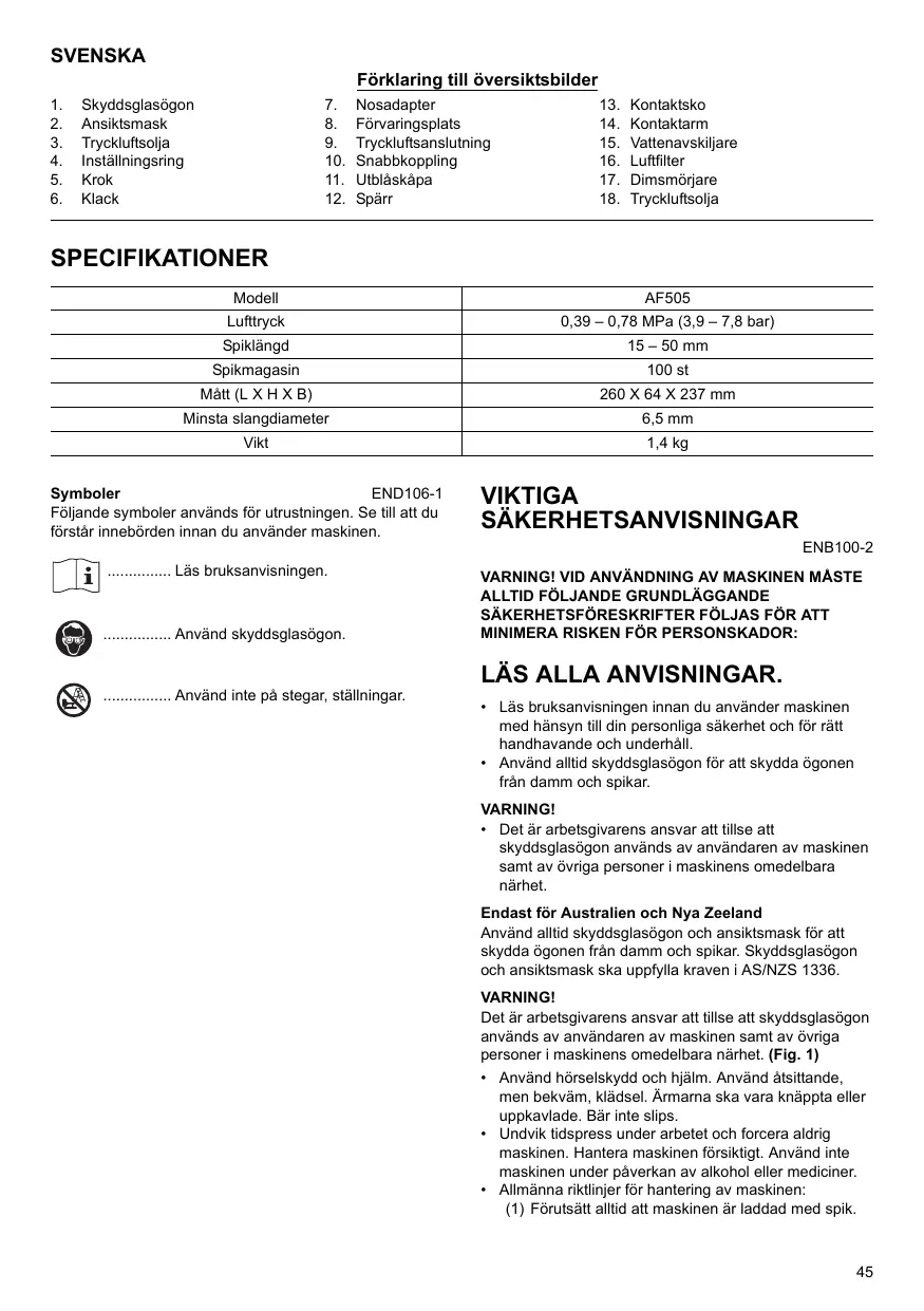Använd alltid skyddsglasögon och ansiktsmask für att skydda ögonen frän damm och spikar. Skyddsglasögon och ansiktsmask skupaftylla kraven i AS/NZS 1336.
