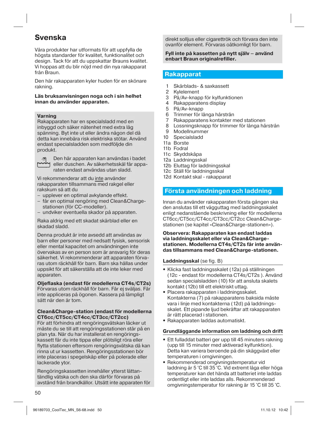 Svenska Våra produkter har utformats för att uppfylla de högsta standarder för kvalitet, funktionalitet och design. Tack för att du uppskattar Brauns kvalitet. Vi hoppas att du blir nöjd med din nya rakapparat från Braun. Den här rakapparaten kyler huden för en skönare rakning. Läs bruksanvisningen noga och i sin helhet innan du använder apparaten. Varning Rakapparaten har en specialsladd med en inbyggd och säker nätenhet med extra låg spänning. Byt inte ut eller ändra någon del då detta kan innebära risk elektriska stötar. Använd endast specialsladden som medföljde din produkt. Den här apparaten kan användas i badet eller duschen. Av säkerhetsskäl får apparaten endast användas utan sladd. Vi rekommenderar att du inte använder rakapparaten tillsammans med rakgel eller rakskum så att du – upplever en optimal avkylande effekt. – får en optimal rengöring med Clean&Chargestationen (för CC-modeller). – undviker eventuella skador på apparaten. Raka aldrig med ett skadat skärblad eller en skadad sladd. Denna produkt är inte avsedd att användas av barn eller personer med nedsatt fysisk, sensorisk eller mental kapacitet om användningen inte övervakas av en person som är ansvarig för deras säkerhet. Vi rekommenderar att apparaten förvaras utom räckhåll för barn. Barn ska hållas under uppsikt för att säkerställa att de inte leker med apparaten. Oljeflaska (endast för modellerna CT4s/CT2s) Förvaras utom räckhåll för barn. Får ej sväljas. Får inte appliceras på ögonen. Kassera på lämpligt sätt när den är tom. Clean&Charge-station (endast för modellerna CT6cc/CT5cc/CT4cc/CT3cc/CT2cc) För att förhindra att rengöringsvätskan läcker ut måste du se till att rengöringsstationen står på en plan yta. När du har installerat en rengöringskassett får du inte tippa eller plötsligt röra eller flytta stationen eftersom rengöringsvätska då kan rinna ut ur kassetten. Rengöringsstationen bör inte placeras i spegelskåp eller på polerade eller lackerade ytor. Rengöringskassetten innehåller ytterst lättantändlig vätska och den ska därför förvaras på avstånd från brandkällor. Utsätt inte apparaten för direkt solljus eller cigarettrök och förvara den inte ovanför element. Förvaras oåtkomligt för barn. Fyll inte på kassetten på nytt själv – använd enbart Braun originalrefiller. Rakapparat