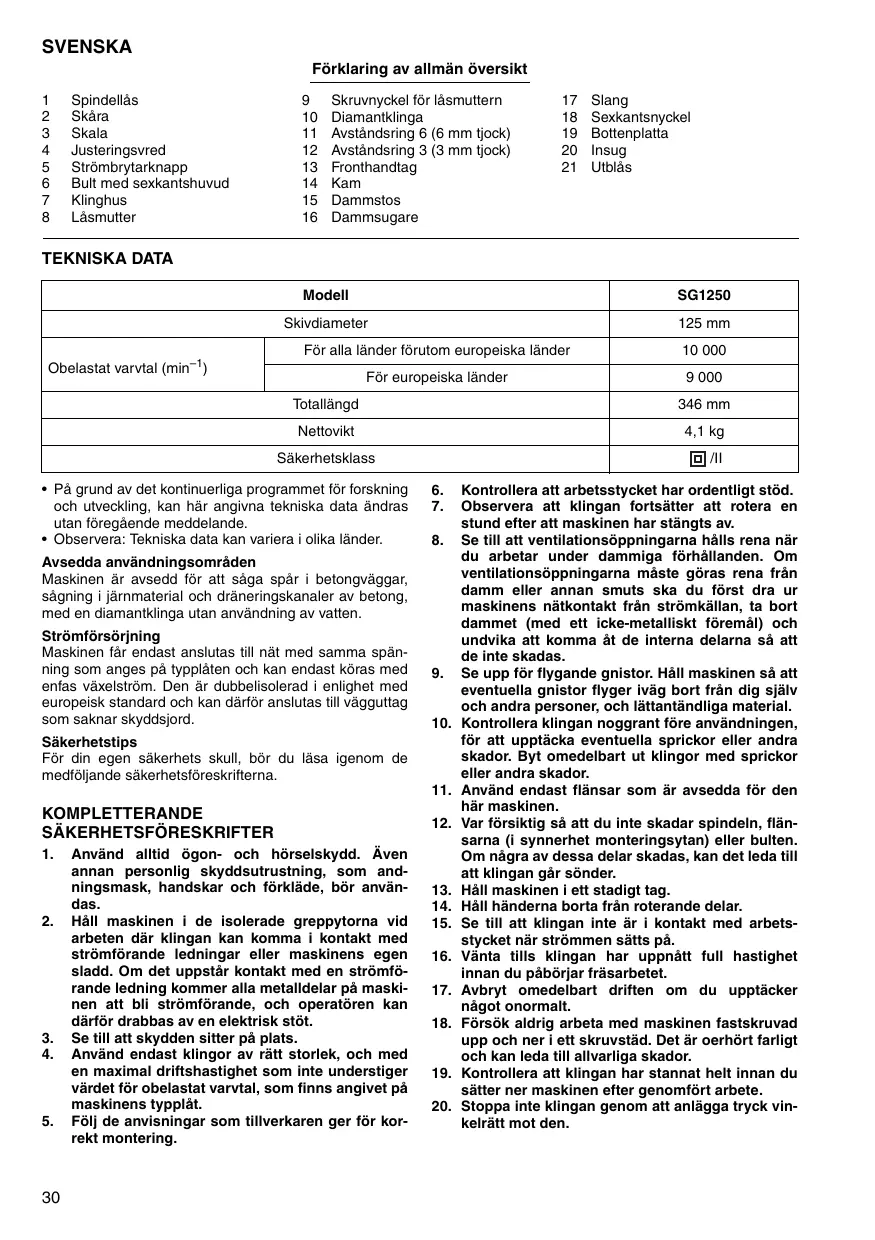 1 Spindelläs 9 Skruvnyckel for läsmutter 17 Sang 2 Skära 10. Diamantklinga 18 Sexkantsnyckel 3 Skala 11. Avständsring 6 (6 mm tock) 19. Bottenplatia 4 Justeringsvred 12. Avständsring 3 (3 mm tjock) 20 Insug 5 Strombrytarknapp 13. Fronthandtag 21 Utbläs 6 Buit med sexkantshuvud 14 Kam 7 Kinghus 15. Dammstos 8 Läsmutter 16. Dammsugare TEKNISKA DATA Modell SG1250 Skivdiameter 125 mm Fôr alla länder fôrutom europeiska länder 10 000 “1 Obelastat varvtal (in) Fôr europeiska länder 9 000 Totallänga 346 mm Nettovikt A1 kg Säkerhelsklass CII