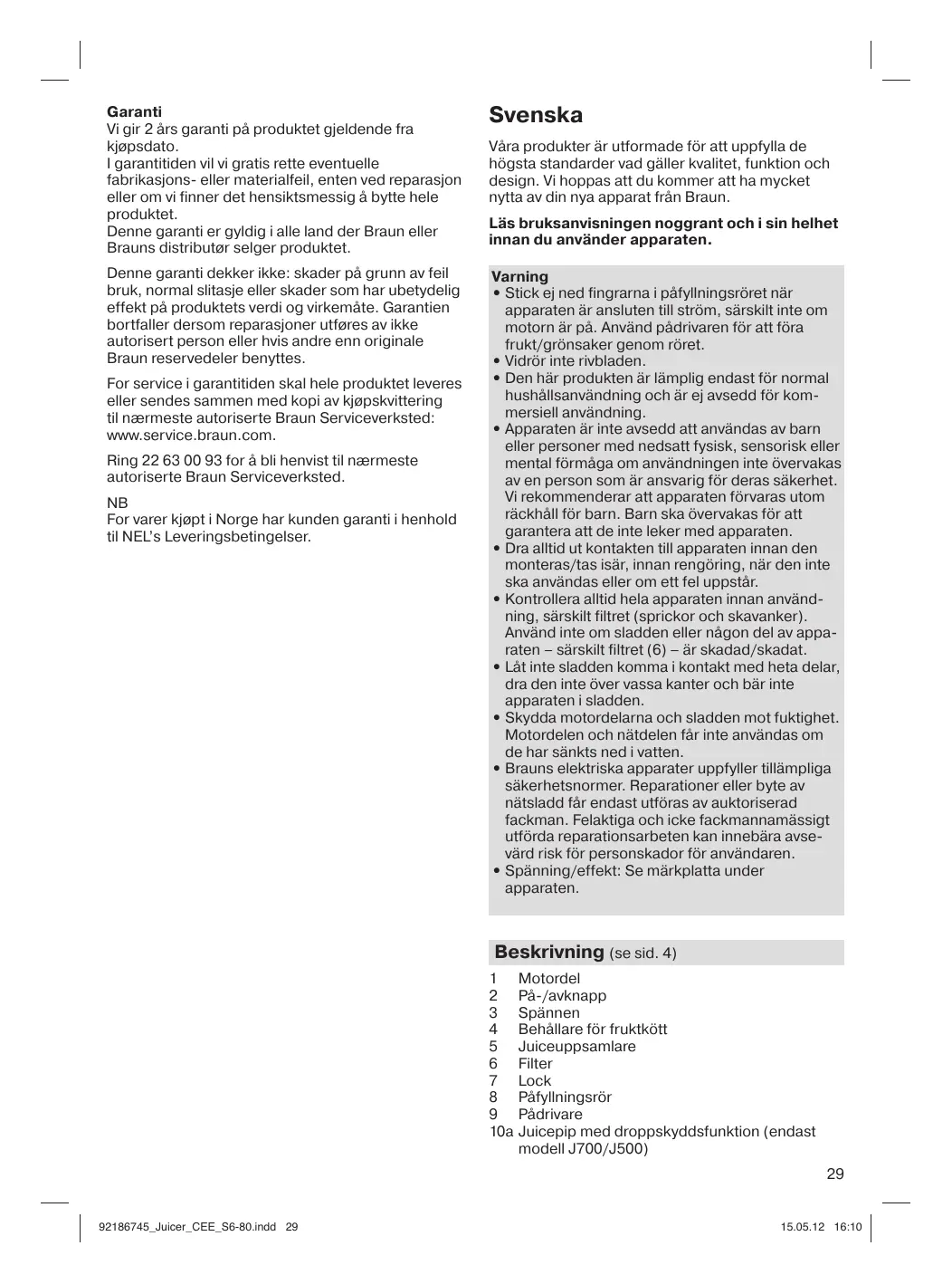 For att erhälla service under garantitiden skall den kompletta apparaten lämnas in tillsammans med inköpskvittot, till ett auktoriserat Braun verkstad: www.service.braun.com.