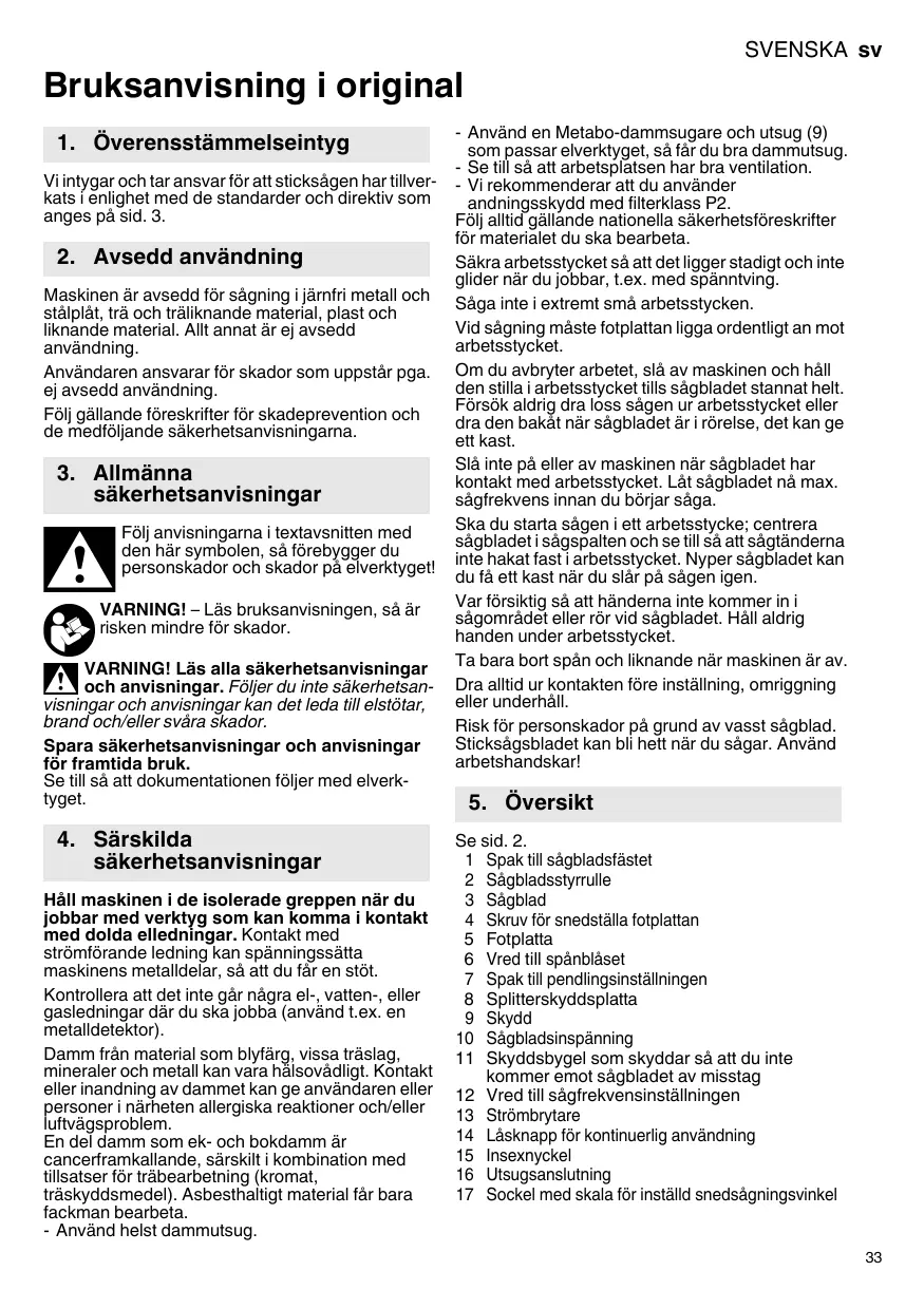 säkerhetsanvi ingar Häll maskinen i de isolerade greppen när du jobbar med verktyg som kan komma i kontakt med dolda elledningar. Kontakt med strémférande ledning kan spänningssätta maskinens metalldelar, sà att du fàr en stôt. Kontrollera att det inte gär nägra el., vatten, eller gasledningar där du ska jobba (använd t.ex. en metalldetektor). Damm frân material som blyfärg, vissa träslag, mineraler och metall kan vara hälsovädligt. Kontakt eller inandning av dammet kan ge användaren eller personer i närheten allergiska reaktioner och/eller luftvägsproblem. En del damm som ek- och bokdamm är cancerframkallande, särskilt kombination med tilsatser fôr träbearbetning (kromat, träskyddsmedel). Asbesthaltigt material fr bara fackman bearbeta. - Använd helst dammutsug. - Använd en Metabo-dammsugare och utsug (0) som passar elverktygel,sà fâr du bra dammuisug. - Se till sà att arbetsplatsen har bra ventilation. - Virekommenderar att du använder andningsskydd med filterklass P2. Fôlj alltid gällande nationella säkerhetsfôreskrifter fèr materialet du ska bearbeta. Säkra arbetsstycket sà att detligger stadigt och inte glider när du jobbar, ex. med Spänntving. Säga inte i extremt smä arbetsstycken. Vid sägning mäste fotplattan ligga ordentligt an mot arbetsstycket. Om du avbryter arbetet, slà av maskinen och hâll den stilla i arbetsstycket tills sägbladet stannat helt. Fôrsôk aldrig dr logs sägen ur arbetsstycke eler dra den bakät när sägbladet är irôrelse, det kan ge ett kast. Slà inte pà eller av maskinen när sägbladet har Kontakt med arbetsstycket. Lât sägbladet nà max. sägfrekvens innan du bôrjar säga. Ska du starta sâgen i ett arbetsstycke; centrera sägbladet i sägspalten och se till sà att sâgtänderna inte hakat fast arbetsstycket. Nyper sägbladet kan du fà ett kast när du slâr pà sägen igen. Var férsiktig s att händerna inte Kommer in i sägomrädet eller rôr vid sägbladet. Häll aldrig handen under arbetsstycket. Ta bara bort spän och liknande när maskinen är av. Dra alltid ur kontakten fôre instälining, omriggning eller underhäll. Risk fôr personskador pä grund av vasst sägblad. Sticksägsbladet kan bli hett när du sägar. Använd arbetshandskar!