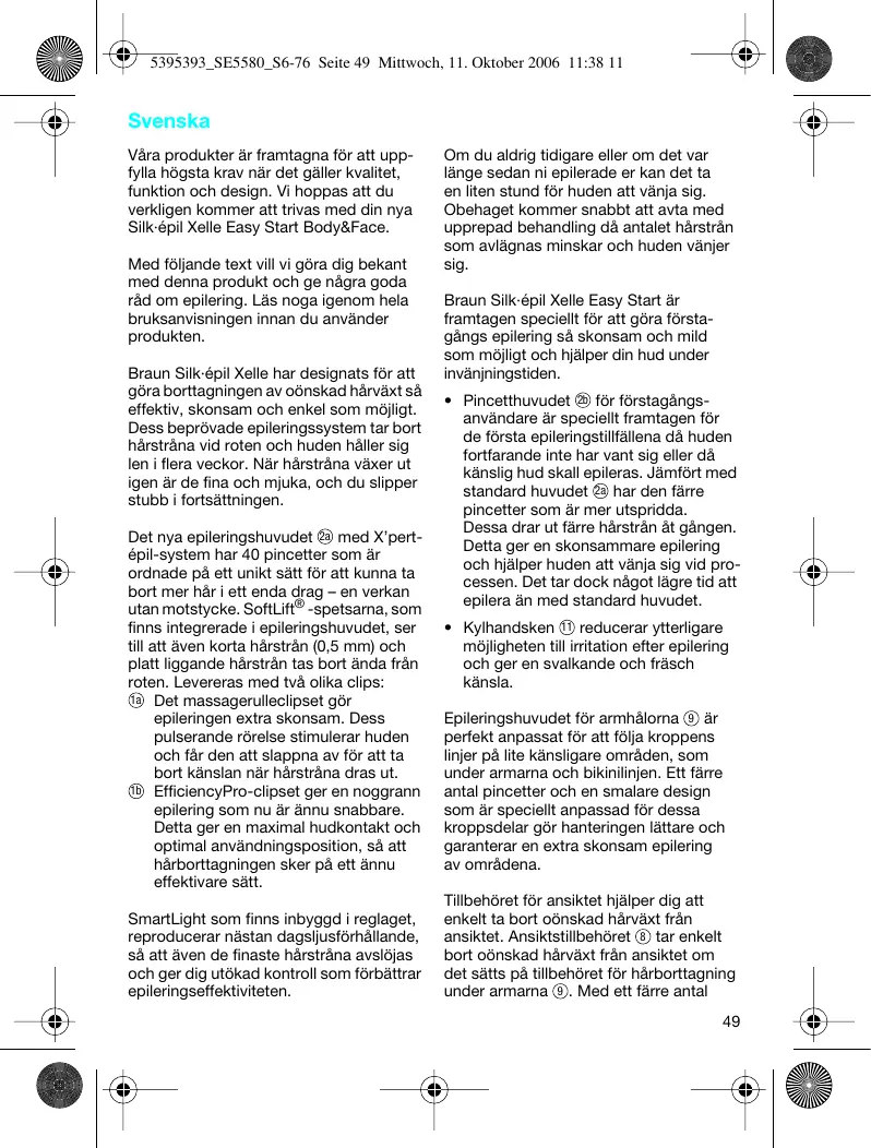 5395393_SE5580_S6-76 Seite 49 Mittwoch, 11. Oktober 2006 11:38 11 Svenska Våra produkter är framtagna för att uppfylla högsta krav när det gäller kvalitet, funktion och design. Vi hoppas att du verkligen kommer att trivas med din nya Silk·épil Xelle Easy Start Body&Face. Med följande text vill vi göra dig bekant med denna produkt och ge några goda råd om epilering. Läs noga igenom hela bruksanvisningen innan du använder produkten. Braun Silk·épil Xelle har designats för att göra borttagningen av oönskad hårväxt så effektiv, skonsam och enkel som möjligt. Dess beprövade epileringssystem tar bort hårstråna vid roten och huden håller sig len i flera veckor. När hårstråna växer ut igen är de fina och mjuka, och du slipper stubb i fortsättningen. Det nya epileringshuvudet 2a med X’pertépil-system har 40 pincetter som är ordnade på ett unikt sätt för att kunna ta bort mer hår i ett enda drag – en verkan utan motstycke. SoftLift® -spetsarna, som finns integrerade i epileringshuvudet, ser till att även korta hårstrån (0,5 mm) och platt liggande hårstrån tas bort ända från roten. Levereras med två olika clips: 1a Det massagerulleclipset gör epileringen extra skonsam. Dess pulserande rörelse stimulerar huden och får den att slappna av för att ta bort känslan när hårstråna dras ut. 1b EfficiencyPro-clipset ger en noggrann epilering som nu är ännu snabbare. Detta ger en maximal hudkontakt och optimal användningsposition, så att hårborttagningen sker på ett ännu effektivare sätt. SmartLight som finns inbyggd i reglaget, reproducerar nästan dagsljusförhållande, så att även de finaste hårstråna avslöjas och ger dig utökad kontroll som förbättrar epileringseffektiviteten. Om du aldrig tidigare eller om det var länge sedan ni epilerade er kan det ta en liten stund för huden att vänja sig. Obehaget kommer snabbt att avta med upprepad behandling då antalet hårstrån som avlägnas minskar och huden vänjer sig. Braun Silk·épil Xelle Easy Start är framtagen speciellt för att göra förstagångs epilering så skonsam och mild som möjligt och hjälper din hud under invänjningstiden.