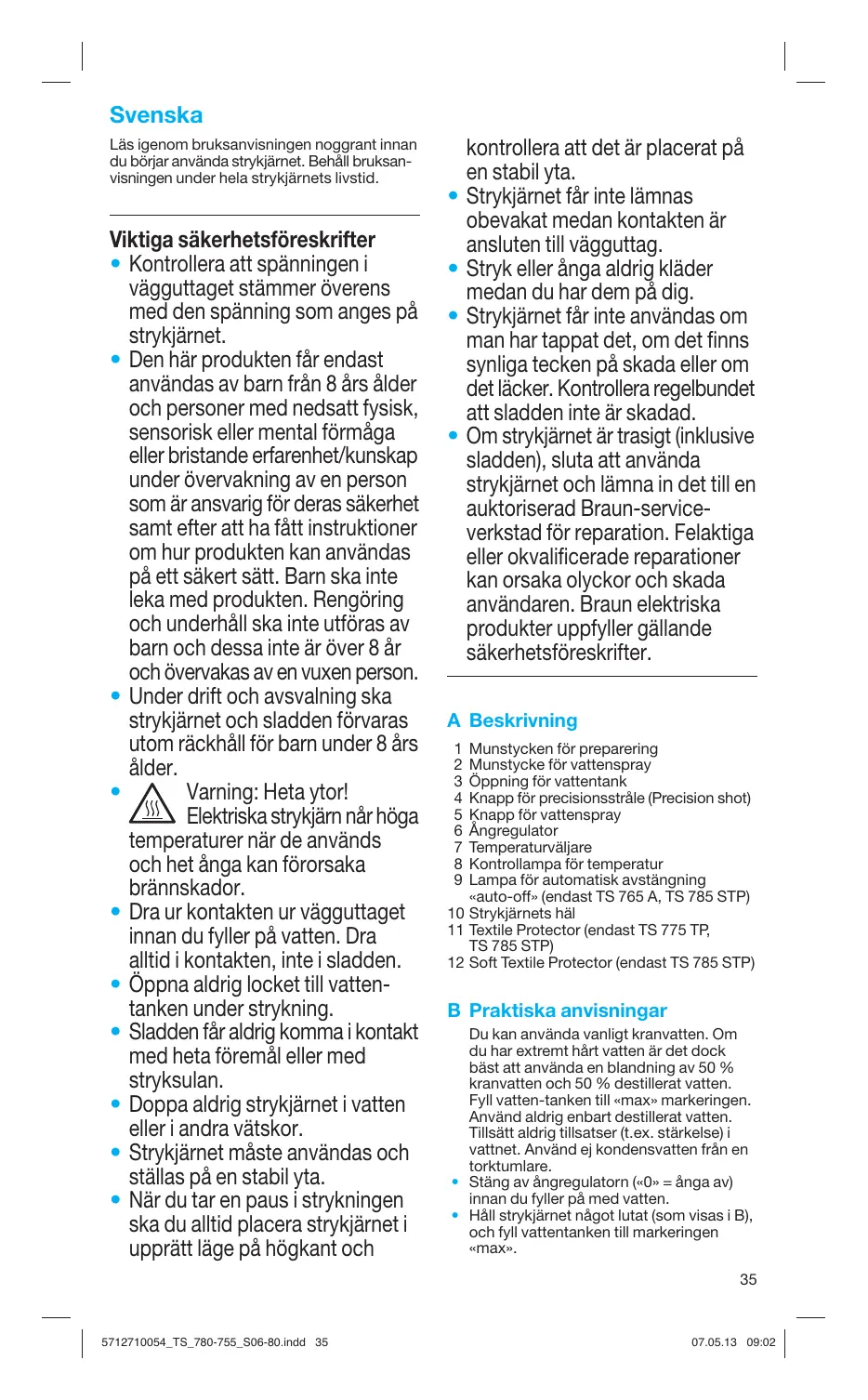 Munstycken för preparering Munstycke för vattenspray Öppning för vattentank Knapp för precisionsstråle (Precision shot) Knapp för vattenspray Ångregulator Temperaturväljare Kontrollampa för temperatur Lampa för automatisk avstängning «auto-off» (endast TS 765 A, TS 785 STP) 10 Strykjärnets häl 11 Textile Protector (endast TS 775 TP, TS 785 STP) 12 Soft Textile Protector (endast TS 785 STP) B Praktiska anvisningar Du kan använda vanligt kranvatten. Om du har extremt hårt vatten är det dock bäst att använda en blandning av 50 % kranvatten och 50 % destillerat vatten. Fyll vatten-tanken till «max» markeringen. Använd aldrig enbart destillerat vatten. Tillsätt aldrig tillsatser (t.ex. stärkelse) i vattnet. Använd ej kondensvatten från en torktumlare.