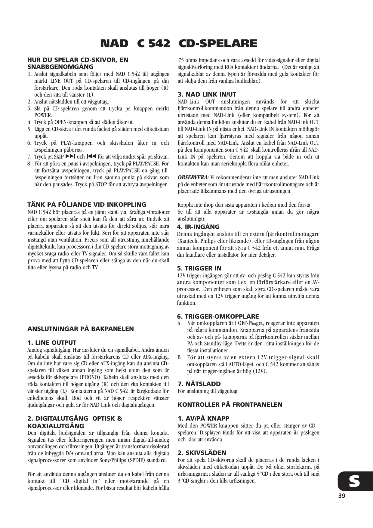 S OBSERVERA: Lägg inga främmande föremål i CD-spelaren då det kan skada maskinen. NAD C 542 är inte konstruerad att användas med så kallade dämpskivor, inte heller skall du lägga två CDskivor i släden. NAD C 542 är bara avsedd för vanliga ljud-CD. CD-ROM, DVD, CDVideo, CDi och PHOTO-CD fungerar inte i denna spelare.