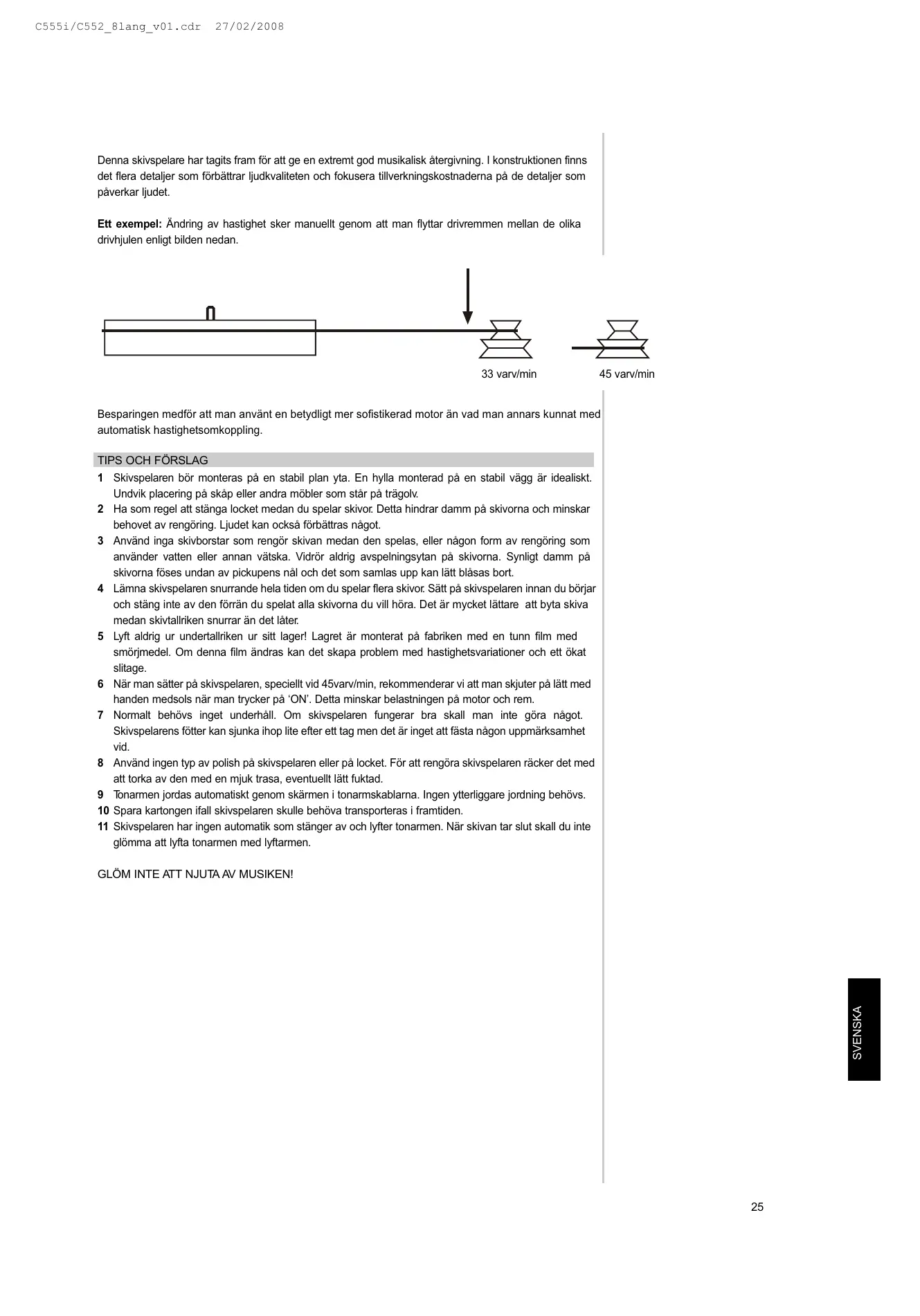 2 Dans la mesure du possible, le couvercle doit rester fermé pendant la lecture des disques. Cette précaution empêche la poussière de se déposer sur les disques et rend leur nettoyage inutile. Elle permet aussi d’améliorer la reproduction du son. 3 N’utilisez pas d’appareil qui nettoie les disques pendant la lecture, ni de dispositif de nettoyage qui fonctionne avec de l’eau ou un liquide quelconque. Ne touchez pas la surface de lecture des disques. Toute poussière visible à la surface du disque est simplement balayée par la pointe; en cas d’accumulation de poussières au niveau de la pointe, il suffit de la dégager en soufflant dessus. 4 Dans la mesure du possible, laissez tourner le plateau en permanence pendant une séance d’écoute de disques. Mettez l’appareil en marche avant de commencer et ne l’éteignez pas avant la fin du dernier disque. Changer un disque alors que le plateau tourne, ce n’est pas aussi facile que l’on puisse le penser ! 5 NE SOULEVEZ PAS l e moyeu central de son palier. Le palier a été assemblé chez le fabricant avec une couche de lubrifiant épais. Si vous dérangez cet assemblage, cela peut entraîner de graves problèmes d’usure et d’oscillations de vitesse. 6 Lorsque vous mettez la platine tourne-disques en marche, surtout à 45 tr/mn, il est recommandé de lancer manuellement le plateau dans le sens des aiguilles d’une montre au moment où vous appuyez sur le bouton “MARCHE”. En procédant ainsi, vous diminuerez les contraintes sur le moteur et la courroie. 7 Aucune maintenance n’est normalement nécessaire. Si la platine tourne-disques fonctionne correctement, ne touchez à rien. Après quelques mois, il se pourrait que les pieds antivibratoires se tassent un peu, faisant pencher la platine légèrement en arrière, mais cela ne doit susciter aucune inquiétude. 8 N’utilisez aucun produit pour nettoyer la platine ou son couvercle. Pour éliminer la poussière, essuyez doucement avec un chiffon doux (légèrement humecté si c’est vraiment nécessaire). 9 Le bras de lecture est automatiquement relié à la terre (ou à la masse) via le blindage du câble du bras. Aucune autre mise à la terre ne devrait être nécessaire. 10 Conservez les emballages, pour le cas où vous auriez besoin de transporter la platine tourne-disques à nouveau. 11 Lorsque vous avez fini d’écouter une face d’un disque, n’oubliez pas de relever la pointe de la surface du disque en vous servant du lève-bras. IL NE VOUS RESTE PLUS QU’À PROFITER DE LA MUSIQUE !