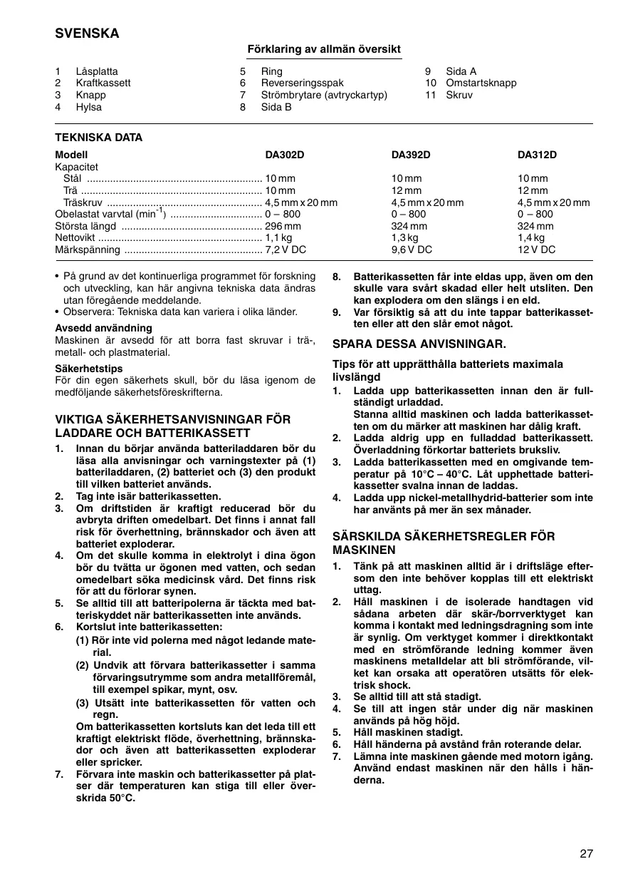 DA392D DA312D 10 mm 12 mm 4,5 mm x 20 mm 0 – 800 324 mm 1,3 kg 9,6 V DC 10 mm 12 mm 4,5 mm x 20 mm 0 – 800 324 mm 1,4 kg 12 V DC Batterikassetten får inte eldas upp, även om den skulle vara svårt skadad eller helt utsliten. Den kan explodera om den slängs i en eld. Var försiktig så att du inte tappar batterikassetten eller att den slår emot något. SPARA DESSA ANVISNINGAR. Tips för att upprätthålla batteriets maximala livslängd