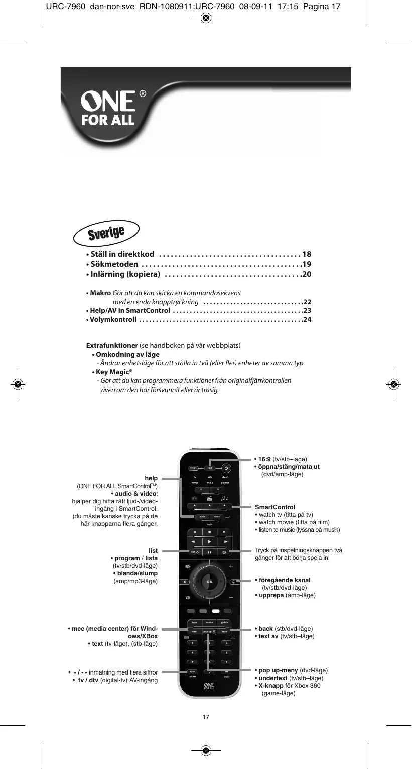 Téléchargez la notice de votre Universell fjärrkontroll au format PDF gratuitement ! Retrouvez votre notice URC 7962 - ONE FOR ALL et reprennez votre appareil électronique en main. Sur cette page sont publiés tous les documents nécessaires à l'utilisation de votre appareil URC 7962 de la marque ONE FOR ALL.