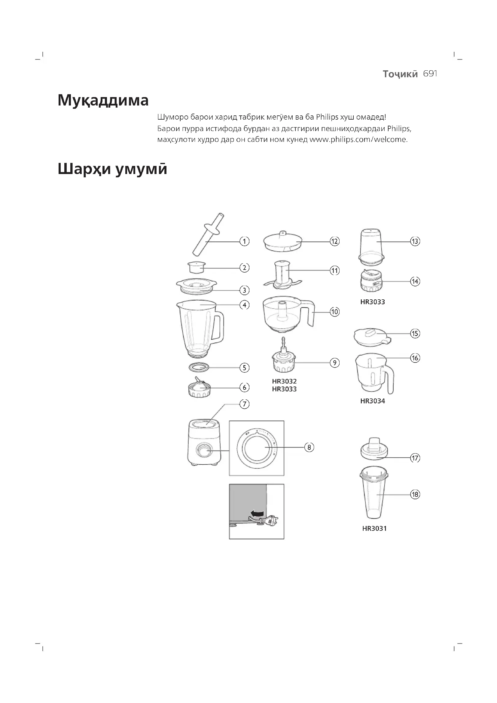 Шуморо барои харид табрик мегӯем ва ба Philips хуш омадед! Барои пурра истифода бурдан аз дастгирии пешниҳодкардаи Philips, маҳсулоти худро дар он сабти ном кунед www.philips.com/welcome. Шарҳи умумӣ HR3034HR3031 HR3033HR3032 HR3033