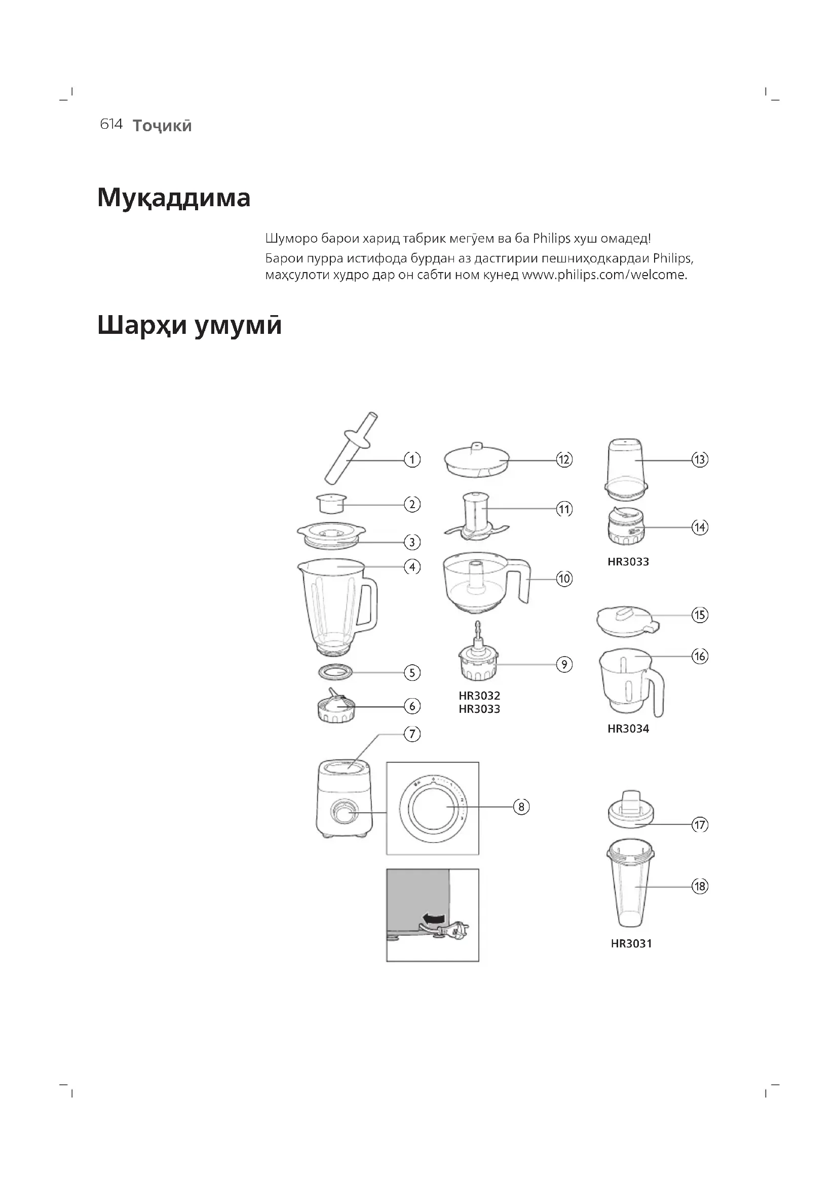 Шуморо барои харид табрик мегӯем ва ба Philips хуш омадед! Барои пурра истифода бурдан аз дастгирии пешниҳодкардаи Philips, маҳсулоти худро дар он сабти ном кунед www.philips.com/welcome. Шарҳи умумӣ HR3034HR3031 HR3033HR3032 HR3033