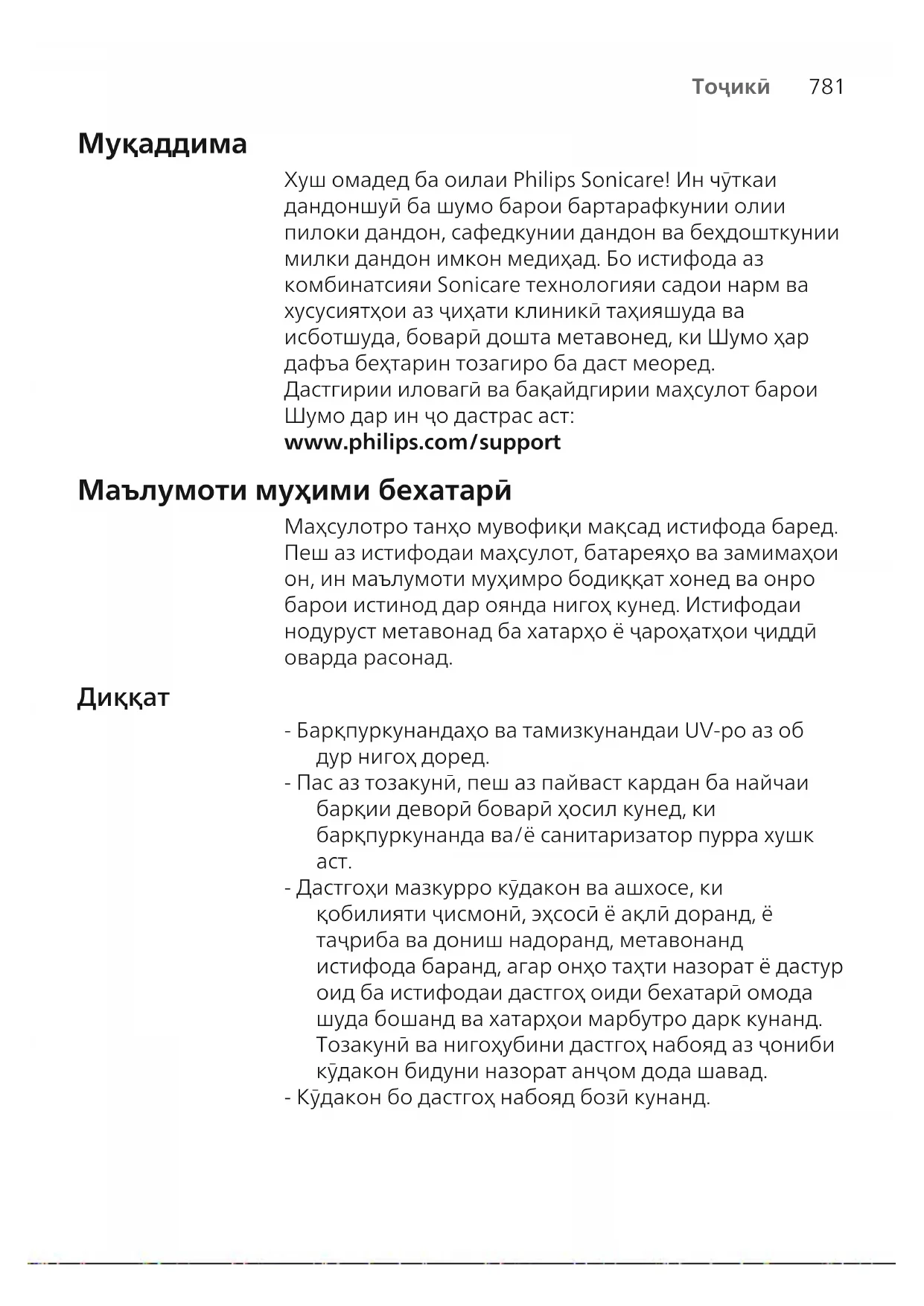 Хуш омадед ба оилаи Philips Sonicare! Ин чӯткаи дандоншуӣ ба шумо барои бартарафкунии олии пилоки дандон, сафедкунии дандон ва беҳдошткунии милки дандон имкон медиҳад. Бо истифода аз комбинатсияи Sonicare технологияи садои нарм ва хусусиятҳои аз ҷиҳати клиникӣ таҳияшуда ва исботшуда, боварӣ дошта метавонед, ки Шумо ҳар дафъа беҳтарин тозагиро ба даст меоред. Дастгирии иловагӣ ва бақайдгирии маҳсулот барои Шумо дар ин ҷо дастрас аст: www.philips.com/support Маълумоти муҳими бехатарӣ Маҳсулотро танҳо мувофиқи мақсад истифода баред. Пеш аз истифодаи маҳсулот, батареяҳо ва замимаҳои он, ин маълумоти муҳимро бодиққат хонед ва онро барои истинод дар оянда нигоҳ кунед. Истифодаи нодуруст метавонад ба хатарҳо ё ҷароҳатҳои ҷиддӣ оварда расонад.