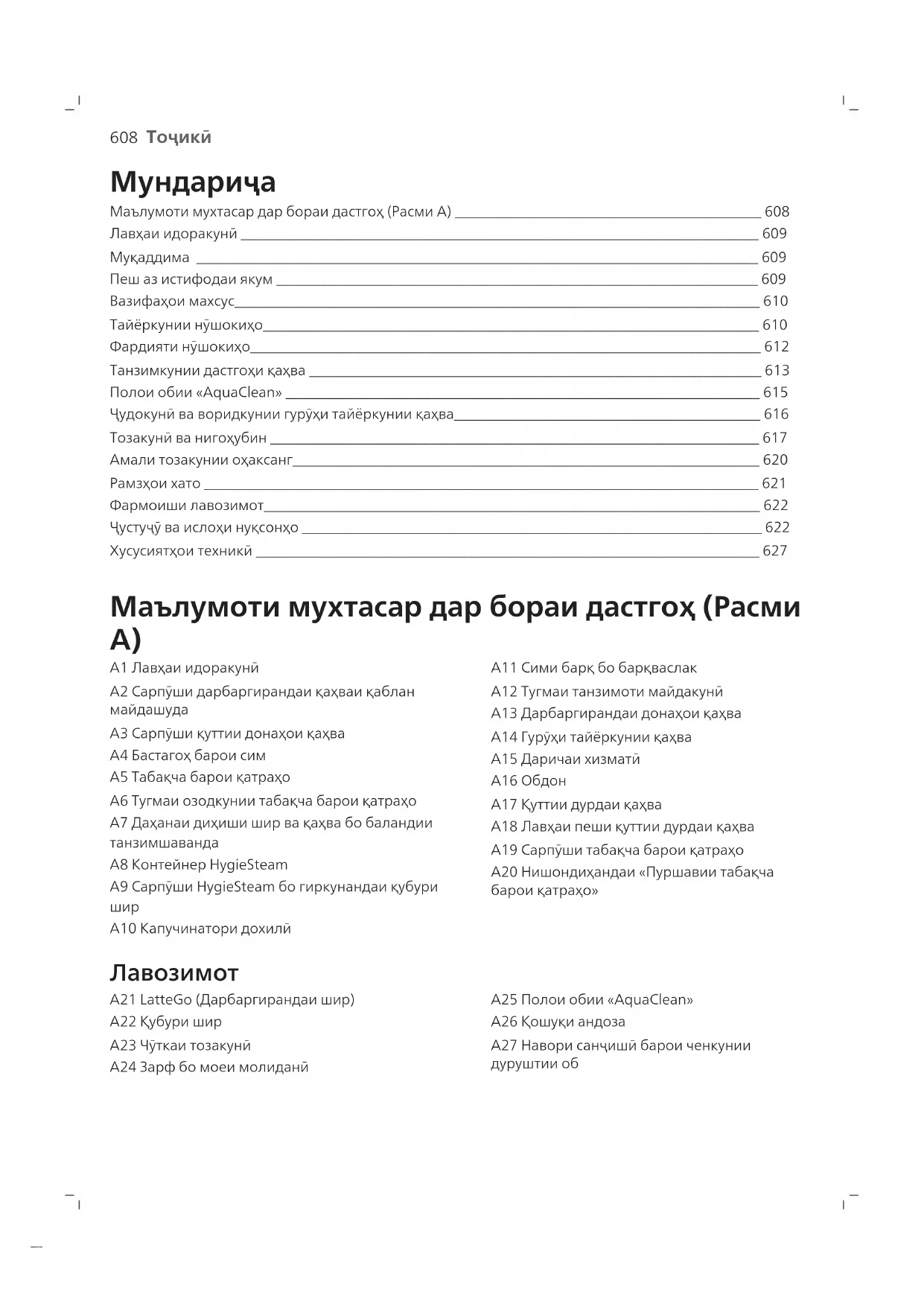 A21 LatteGo (Дарбаргирандаи шир) A22 Қубури шир A23 Чӯткаи тозакунӣ A24 Зарф бо моеи молиданӣ A25 Полои обии «AquaClean» A26 Қошуқи андоза A27 Навори санҷишӣ барои ченкунии дуруштии об609