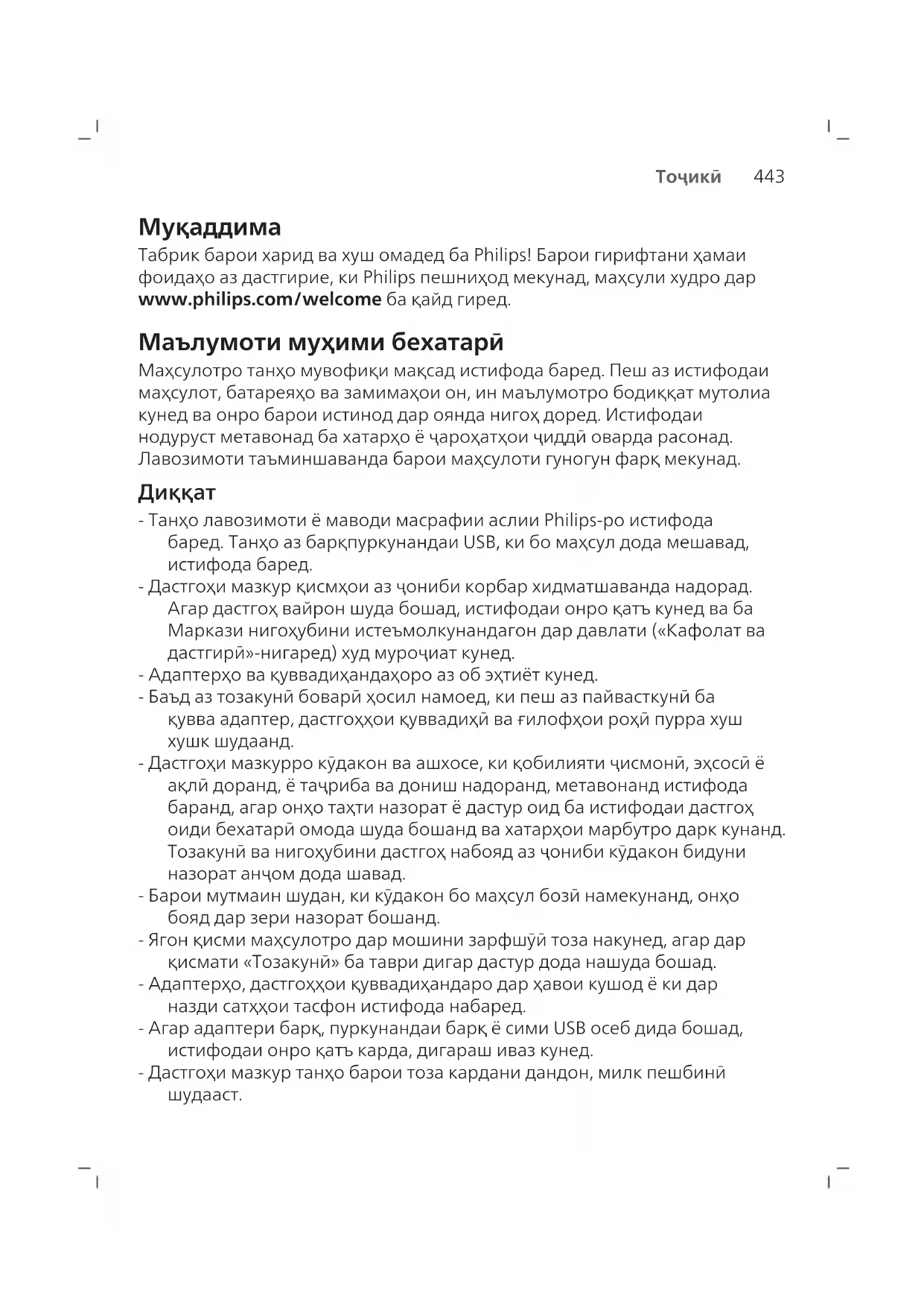 Табрик барои харид ва хуш омадед ба Philips! Барои гирифтани ҳамаи фоидаҳо аз дастгирие, ки Philips пешниҳод мекунад, маҳсули худро дар www.philips.com/welcome ба қайд гиред. Маълумоти муҳими бехатарӣ Маҳсулотро танҳо мувофиқи мақсад истифода баред. Пеш аз истифодаи маҳсулот, батареяҳо ва замимаҳои он, ин маълумотро бодиққат мутолиа кунед ва онро барои истинод дар оянда нигоҳ доред. Истифодаи нодуруст метавонад ба хатарҳо ё ҷароҳатҳои ҷиддӣ оварда расонад. Лавозимоти таъминшаванда барои маҳсулоти гуногун фарқ мекунад.