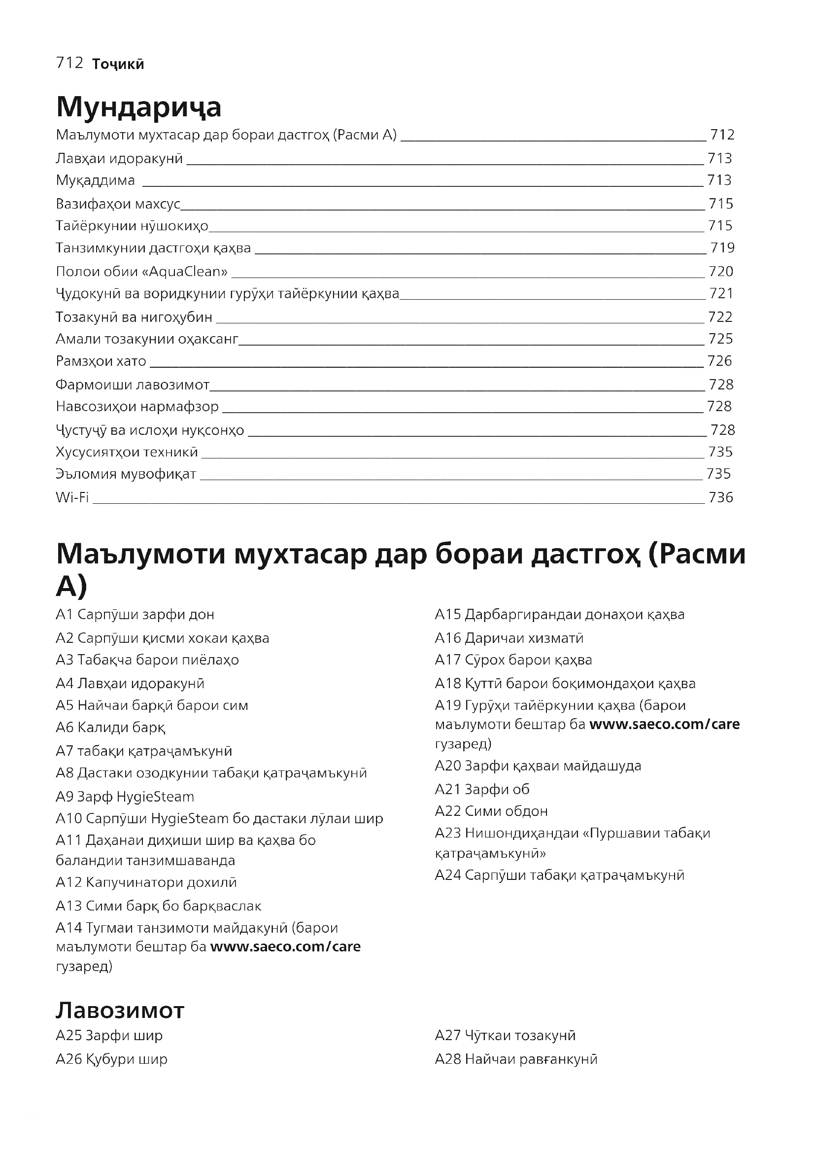 A1 Сарпӯши зарфи дон A2 Сарпӯши қисми хокаи қаҳва A3 Табақча барои пиёлаҳо A4 Лавҳаи идоракунӣ A5 Найчаи барқӣ барои сим A6 Калиди барқ A7 табақи қатраҷамъкунӣ A8 Дастаки озодкунии табақи қатраҷамъкунӣ A9 Зарф HygieSteam A10 Сарпӯши HygieSteam бо дастаки лӯлаи шир A11 Даҳанаи диҳиши шир ва қаҳва бо баландии танзимшаванда A12 Капучинатори дохилӣ A13 Сими барқ бо барқваслак A14 Тугмаи танзимоти майдакунӣ (барои маълумоти бештар ба www.saeco.com/care