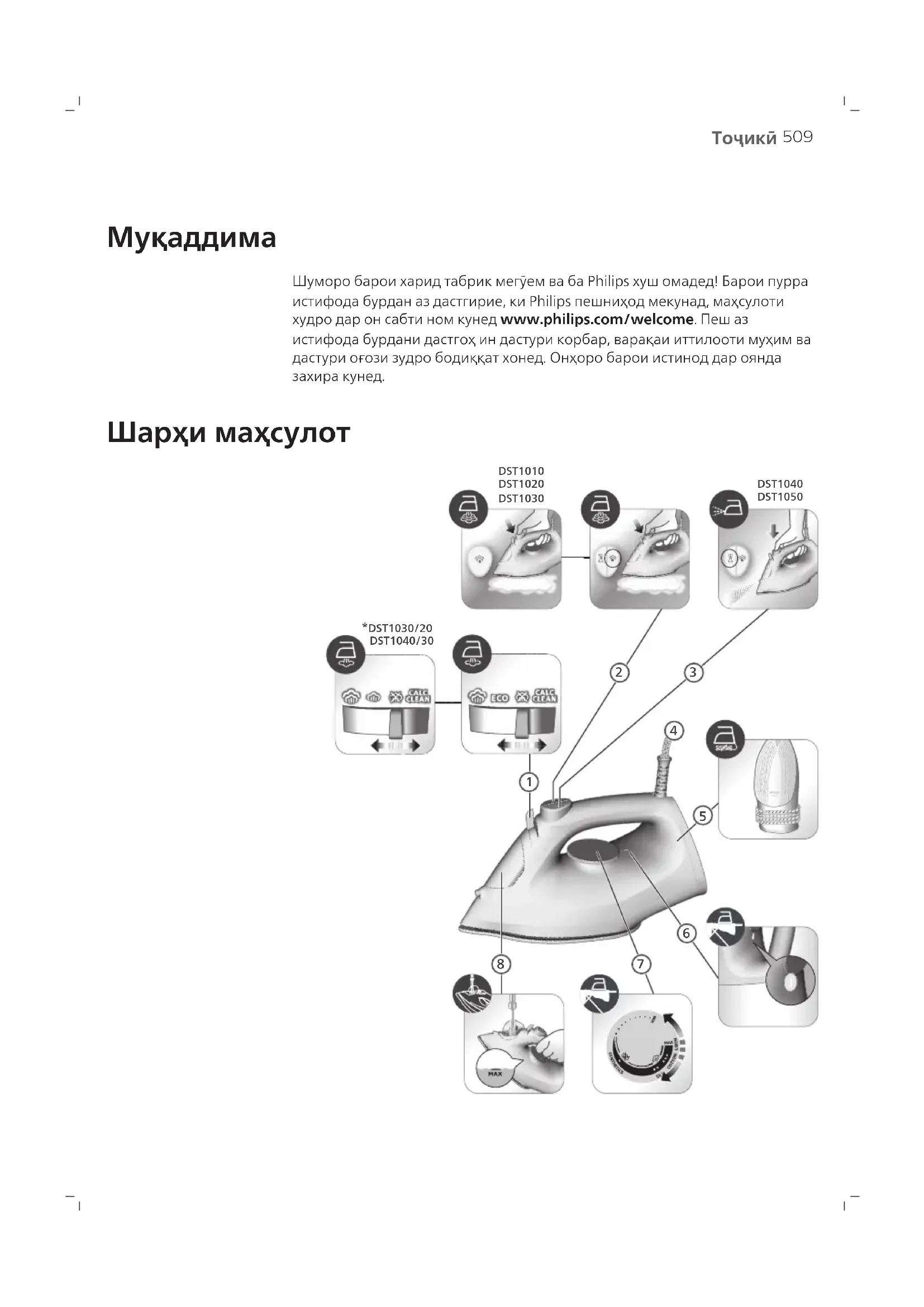 Шуморо барои харид табрик мегӯем ва ба Philips хуш омадед! Барои пурра истифода бурдан аз дастгирие, ки Philips пешниҳод мекунад, маҳсулоти худро дар он сабти ном кунед www.philips.com/welcome. Пеш аз истифода бурдани дастгоҳ ин дастури корбар, варақаи иттилооти муҳим ва дастури оғози зудро бодиққат хонед. Онҳоро барои истинод дар оянда захира кунед. Шарҳи маҳсулот