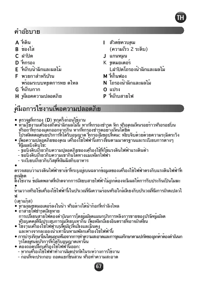 Lฝาปิดโถรองน้ำผักและผลไม้ ท่ี ก้ั นฟอง โถรองน้ำผักและผลไม้ ท่ี เก็บสายไฟ คู่ มือการใช้งานเพ่ื อความปลอดภัย