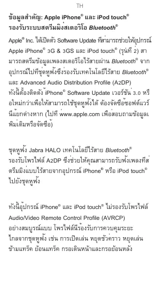 visitez le site Web à : www.jabra.com/HALO DE WICHTIGER HINWEIS: Apple iPhone® und iPod touch® unterstützen Bluetooth®Stereostreaming.