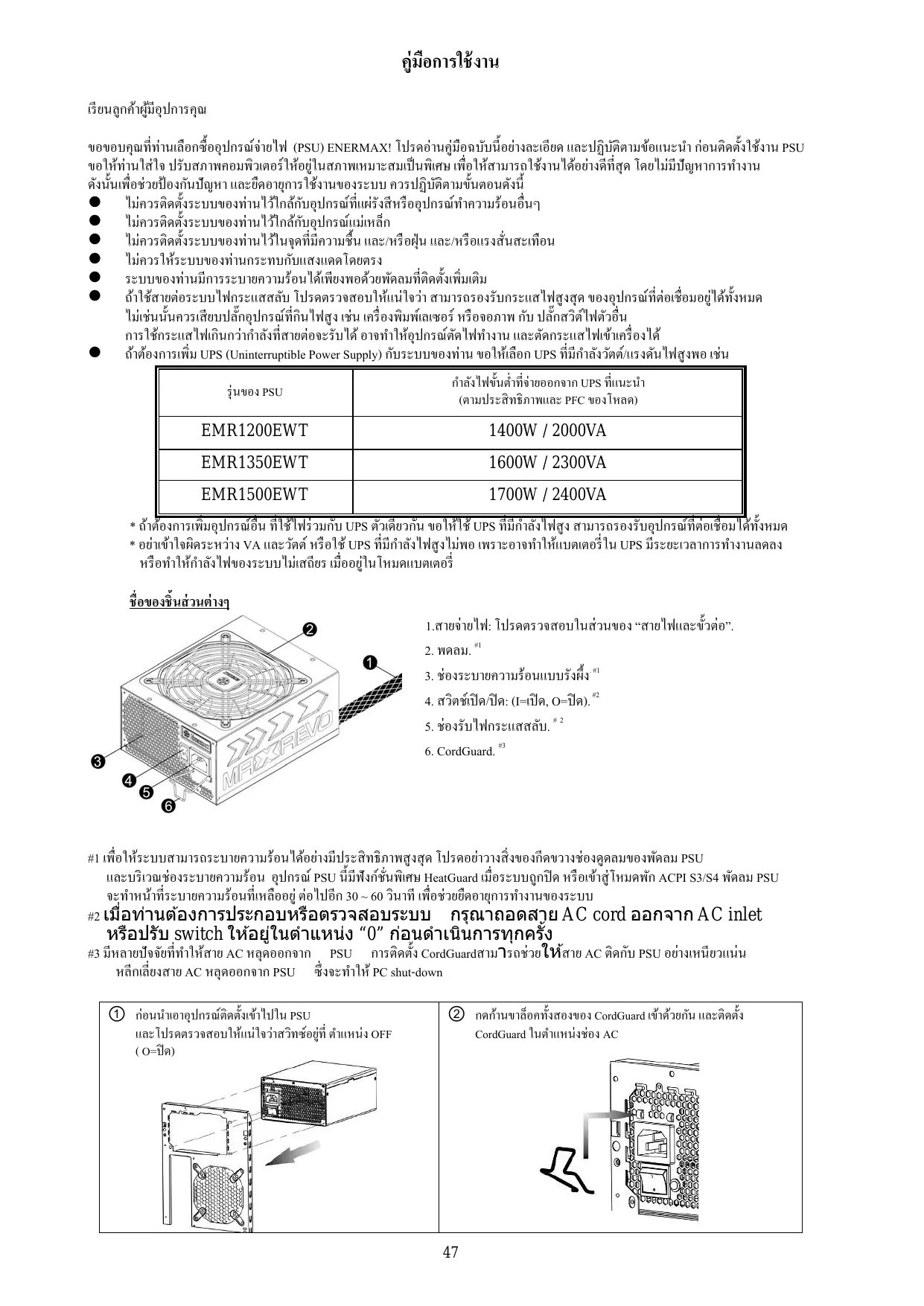 #1 เพื่อให้ระบบสามารถระบายความร้อนได้อย่างมีประสิ ทธิภาพสู งสุ ด โปรดอย่าวางสิ่ งของกีดขวางช่องดูดลมของพัดลม PSU และบริ เวณช่องระบายความร้อน อุปกรณ์ PSU นี้มีฟังก์ชน่ั พิเศษ HeatGuard เมื่อระบบถูกปิ ด หรื อเข้าสู่ โหมดพัก ACPI S3/S4 พัดลม PSU จะทําหน้าที่ระบายความร้อนที่เหลืออยู่ ต่อไปอีก 30 ~ 60 วินาที เพื่อช่วยยืดอายุการทํางานของระบบ #2 เมือ ่ ท่านต ้องการประกอบหรือตรวจสอบระบบ กรุณาถอดสาย AC cord ออกจาก AC inlet หรือปรับ switch ให ้อยูใ่ นตําแหน่ง “0” ก่อนดําเนินการทุกครัง้ #3 มีหลายปัจจัยที่ทาํ ให้สาย AC หลุดออกจาก PSU การติดตั้ง CordGuardสามารถช่วยให ้สาย AC ติดกับ PSU อย่างเหนียวแน่น หลีกเลี่ยงสาย AC หลุดออกจาก PSU ซึ่ งจะทําให้ PC shut-down ① ก่อนนําเอาอุปกรณ์ติดตั้งเข้าไปใน PSU