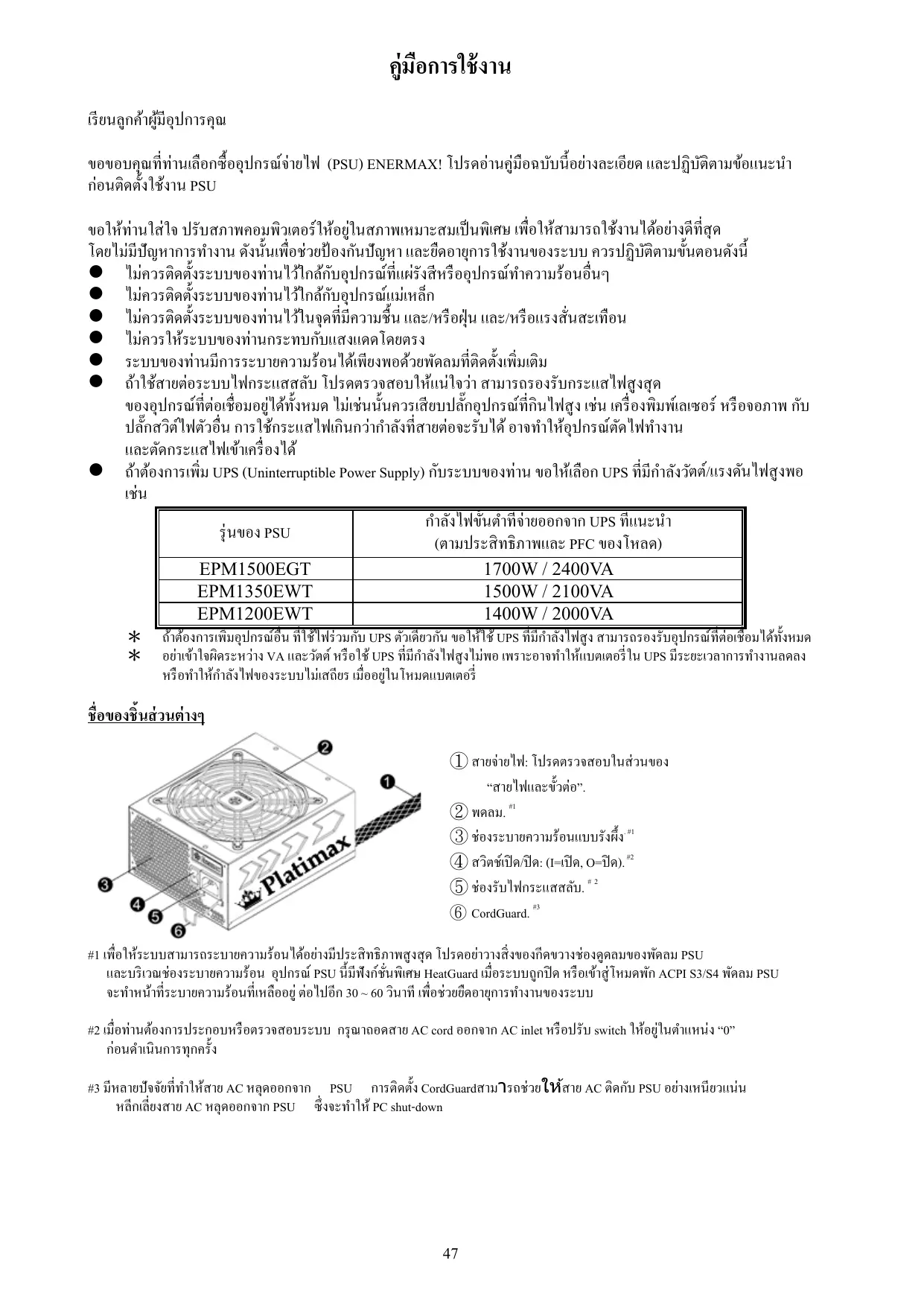 คู่มอื การใช้ งาน เรี ยนลูกค้าผูม้ ีอุปการคุณ ขอขอบคุณที่ท่านเลือกซื้ ออุปกรณ์จ่ายไฟ (PSU) ENERMAX! โปรดอ่านคู่มือฉบับนี้อย่างละเอียด และปฏิบตั ิตามข้อแนะนํา ก่อนติดตั้งใช้งาน PSU ขอให้ท่านใส่ ใจ ปรับสภาพคอมพิวเตอร์ให้อยูใ่ นสภาพเหมาะสมเป็ นพิเศษ เพื่อให้สามารถใช้งานได้อย่างดีที่สุด โดยไม่มีปัญหาการทํางาน ดังนั้นเพื่อช่วยป้ องกันปั ญหา และยืดอายุการใช้งานของระบบ ควรปฏิบตั ิตามขั้นตอนดังนี้ ไม่ควรติดตั้งระบบของท่านไว้ใกล้กบั อุปกรณ์ที่แผ่รังสี หรื ออุปกรณ์ทาํ ความร้อนอื่นๆ ไม่ควรติดตั้งระบบของท่านไว้ใกล้กบั อุปกรณ์แม่เหล็ก ไม่ควรติดตั้งระบบของท่านไว้ในจุดที่มีความชื้น และ/หรื อฝุ่ น และ/หรื อแรงสั่นสะเทือน ไม่ควรให้ระบบของท่านกระทบกับแสงแดดโดยตรง ระบบของท่านมีการระบายความร้อนได้เพียงพอด้วยพัดลมที่ติดตั้งเพิ่มเติม ถ้าใช้สายต่อระบบไฟกระแสสลับ โปรดตรวจสอบให้แน่ใจว่า สามารถรองรับกระแสไฟสูงสุ ด ของอุปกรณ์ที่ต่อเชื่อมอยูไ่ ด้ท้ งั หมด ไม่เช่นนั้นควรเสี ยบปลัก๊ อุปกรณ์ที่กินไฟสู ง เช่น เครื่ องพิมพ์เลเซอร์ หรื อจอภาพ กับ ปลัก๊ สวิตไ์ ฟตัวอื่น การใช้กระแสไฟเกินกว่ากําลังที่สายต่อจะรับได้ อาจทําให้อุปกรณ์ตดั ไฟทํางาน และตัดกระแสไฟเข้าเครื่ องได้ ถ้าต้องการเพิม่ UPS (Uninterruptible Power Supply) กับระบบของท่าน ขอให้เลือก UPS ที่มีกาํ ลังวัตต์/แรงดันไฟสูงพอ เช่น กําลังไฟขั้นตํ่าที่จ่ายออกจาก UPS ที่แนะนํา รุ่ นของ PSU (ตามประสิ ทธิภาพและ PFC ของโหลด) EPM1500EGT 1700W / 2400VA EPM1350EWT 1500W / 2100VA EPM1200EWT 1400W / 2000VA * ถ้าต้องการเพิ่มอุปกรณ์อื่น ที่ใช้ไฟร่ วมกับ UPS ตัวเดียวกัน ขอให้ใช้ UPS ที่มีกาํ ลังไฟสู ง สามารถรองรับอุปกรณ์ที่ต่อเชื่อมได้ท้ งั หมด * อย่าเข้าใจผิดระหว่าง VA และวัตต์ หรื อใช้ UPS ที่มีกาํ ลังไฟสู งไม่พอ เพราะอาจทําให้แบตเตอรี่ ใน UPS มีระยะเวลาการทํางานลดลง หรื อทําให้กาํ ลังไฟของระบบไม่เสถียร เมื่ออยูใ่ นโหมดแบตเตอรี่