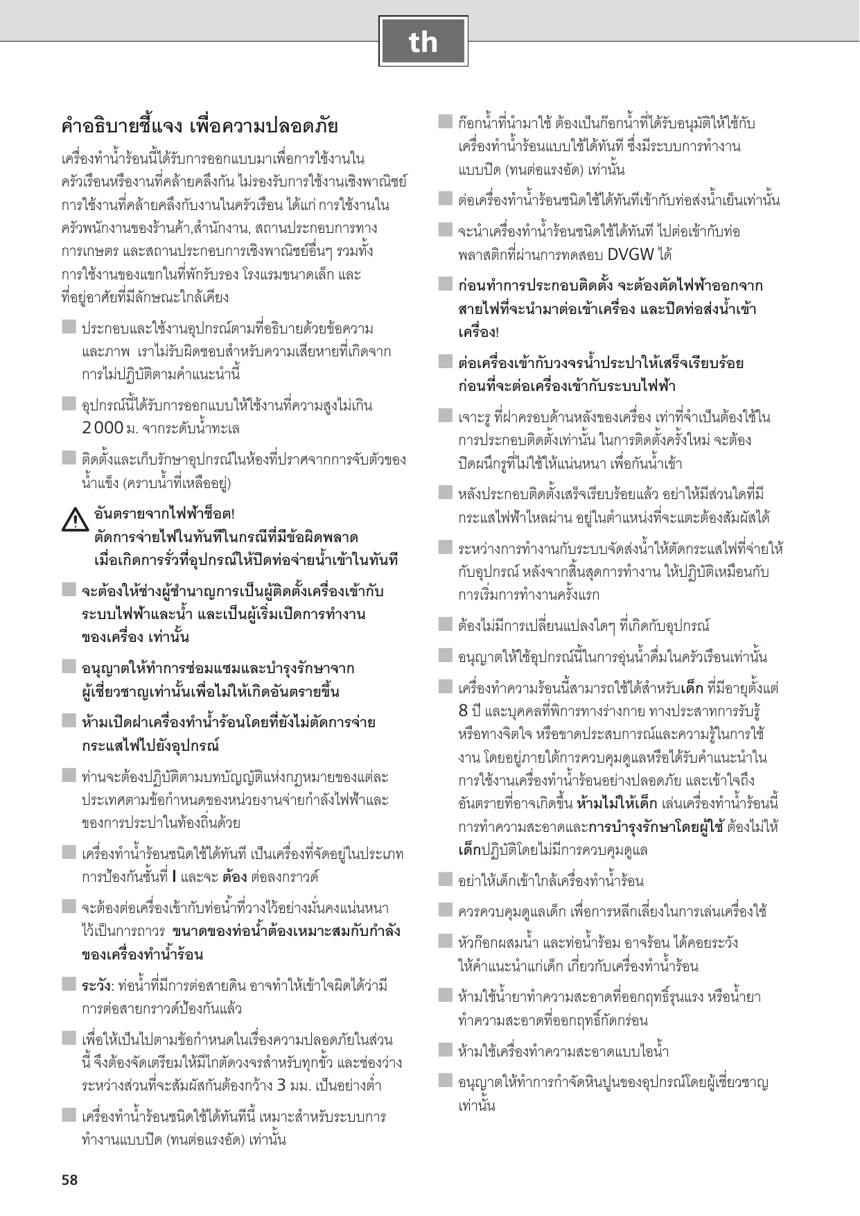 A fault, what to do? Attention! Repairs must only be carried out by an authorised technician. Improper repairs can lead to risk of serious injury to the user. If your appliance does not operate as required, it is often due to a very minor problem. Please check whether you can remedy the fault yourself by using the following guidelines. You will save yourself the costs of an unnecessary visit by customer service personnel. ■ Monter et utiliser l’appareil comme indiqué dans le texte et à l’écran. Nous n’assumons aucune garantie pour les risques susceptibles de survenir en cas de non-respect de cette notice. ■ Cet appareil est destiné à une utilisation jusqu’à une hauteur maximale de 2 000 m au-dessus du niveau de la mer. ■ Toujours installer et stocker l’appareil dans une pièce à l’abri du gel (eau résiduelle). Danger de choc électrique ! En cas d’erreur, déconnectez immédiatement la tension du secteur. En cas de fuite sur l’appareil, immédiatement couper l’alimentation en eau froide. ■ Seul un installateur agréé est autorisé à raccorder et à mettre en marche le chauffe-eau instantané. ■ Pour éviter tous risques, seul un spécialiste a le droit d’effectuer des travaux de réparation et de maintenance. ■ Nʼouvrez jamais l’appareil sans avoir interrompu l’apport de courant à l’appareil. ■ Respectez les prescriptions légales en vigueur dans votre pays ainsi que celles recommandées par les compagnies locales/ nationales distributrices d’électricité et d’eau et applicables dans votre localité. ■ Le chauffe-eau instantané est un appareil qui répond à la classe de protection I. Il doit être raccordé au fil de terre. ■ L’appareil doit être raccordé de manière durable aux conduites d’eau posées de manière fixe. La section de câble doit correspondre à la puissance à installer. ■ Exemple : les conduites d’eau mises à la terre peuvent simuler la présence d’un fil de terre.