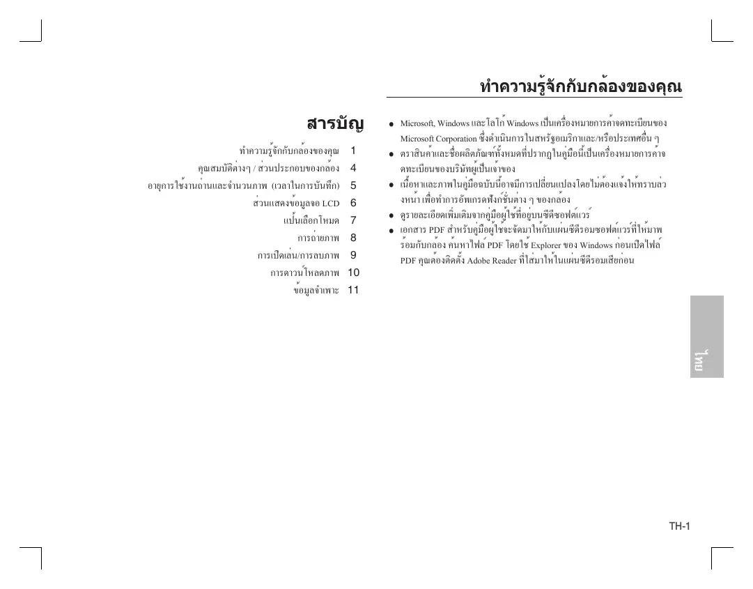 Microsoft, Windows และโลโก้ Windows เป็นเครือ่ งหมายการค้าจดทะเบียนของ Microsoft Corporation ซึง่ ดำเนินการในสหรัฐอเมริกาและ/หรือประเทศอืน่ ๆ ตราสินค้าและชื่อผลิตภัณฑ์ทั้งหมดที่ปรากฏในคู่มือนี้เป็นเครื่องหมายการค้าจ ดทะเบียนของบริษัทผู้เป็นเจ้าของ เนือ้ หาและภาพในคูม่ อื ฉบับนีอ้ าจมีการเปลีย่ นแปลงโดยไม่ตอ้ งแจ้งให้ทราบล่ว งหน้า เพื่อทำการอัพเกรดฟังก์ชั่นต่าง ๆ ของกล้อง ดูรายละเอียดเพิ่มเติมจากคู่มือผู้ใช้ที่อยู่บนซีดีซอฟต์แวร์ เอกสาร PDF สำหรับคู่มือผู้ใช้จะจัดมาให้กับแผ่นซีดีรอมซอฟต์แวร์ที่ให้มาพ ร้อมกับกล้อง ค้นหาไฟล์ PDF โดยใช้ Explorer ของ Windows ก่อนเปิดไฟล์ PDF คุณต้องติดตั้ง Adobe Reader ที่ใส่มาให้ในแผ่นซีดีรอมเสียก่อน