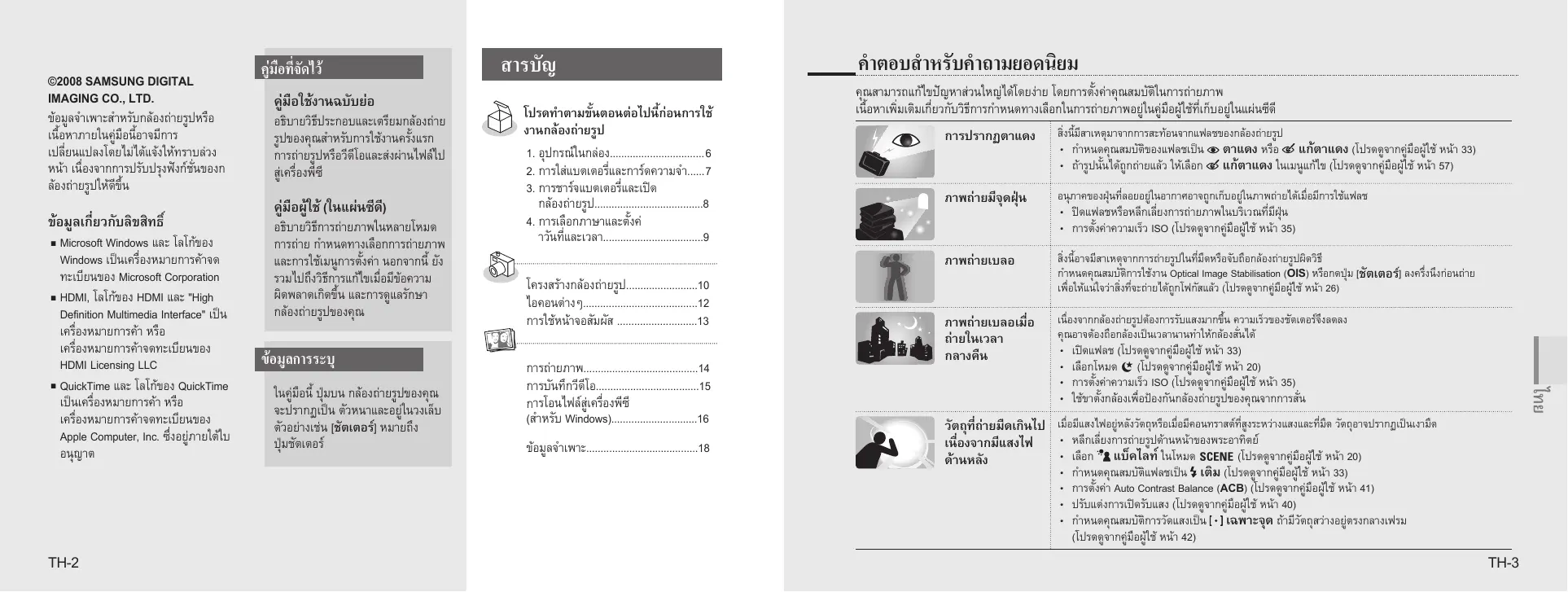 SCC-NV5 HD ﻗﺪ ﻳﺨﺘﻠﻒ ﻣﺼﺪﺭ ﺍﻟﺘﻴﺎﺭ ﺑﺎﺧﺘﻼﻑ ﺍﻟﻤﻨﻄﻘﺔ. ١٩٫٩ × ٥٩٫٥ × ٩٤٫٩ﻣﻢ )ﺑﺪﻭﻥ ﺍﻷﺟﺰﺍء ﺍﻟﺒﺎﺭﺯﺓ( 19-AR ©2008 SAMSUNG DIGITAL IMAGING CO., LTD. ขอมูลจำเพาะสำหรับกลองถายรูปหรือ เนือ้ หาภายในคูม อื นีอ้ าจมีการ เปลีย่ นแปลงโดยไมไดแจงใหทราบลวง หนา เนือ่ งจากการปรับปรุงฟงกชนั่ ของก ลองถายรูปใหดขี นึ้ ขอมูลเกีย่ วกับลิขสิทธิ์ คูม อื ใชงานฉบับยอ อธิบายวิธปี ระกอบและเตรียมกลองถาย รูปของคุณสำหรับการใชงานครัง้ แรก การถายรูปหรือวีดโี อและสงผานไฟลไป สูเ ครือ่ งพีซี คูม อื ผูใ ช (ในแผนซีด)ี อธิบายวิธกี ารถายภาพในหลายโหมด การถาย กำหนดทางเลือกการถายภาพ และการใชเมนูการตัง้ คา นอกจากนี้ ยัง รวมไปถึงวิธกี ารแกไขเมือ่ มีขอ ความ ผิดพลาดเกิดขึน้ และการดูแลรักษา กลองถายรูปของคุณ ขอมูลการระบุ ในคูม อื นี้ ปุม บน กลองถายรูปของคุณ จะปรากฏเปน ตัวหนาและอยูใ นวงเล็บ ตัวอยางเชน [ชัตเตอร] หมายถึง ปุม ชัตเตอร