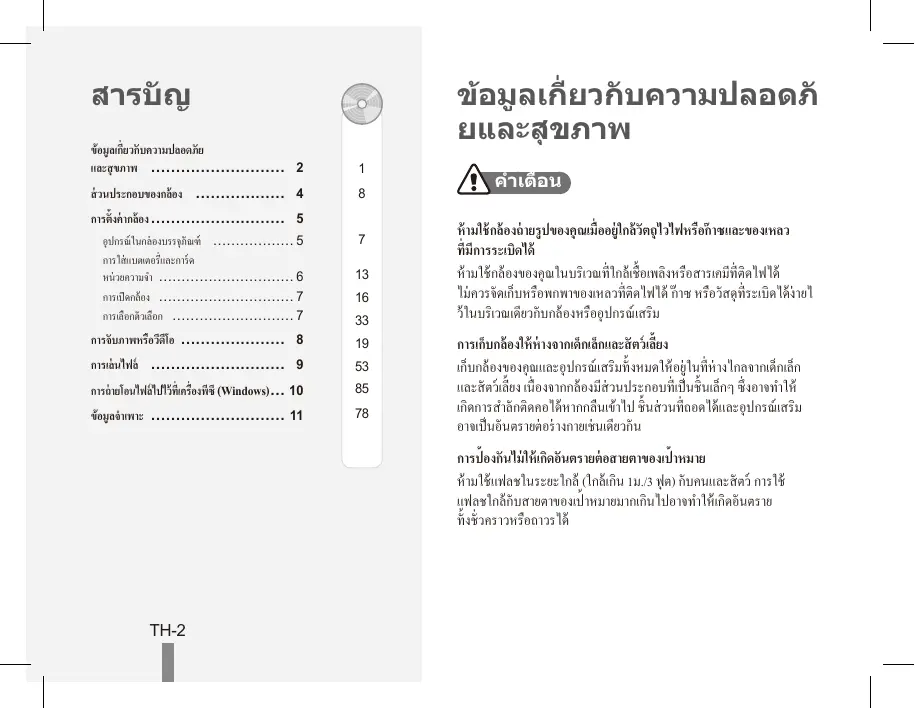 หามใชกลองถายรูปของคุ ณเมื่ ออยูใกลวัตถุ ไวไฟหรือกาซและของเหลว ที่มีการระเบิดได หามใชกลองของคุ ณในบริเวณที่ ใกลเชื้ อเพลิงหรือสารเคมีที่ติดไฟได ไมควรจั ดเก็บหรือพกพาของเหลวที่ ติดไฟได กาซ หรือวั สดุ ที่ระเบิ ดไดงายไ วในบริเวณเดียวกั บกลองหรืออุ ปกรณเสริม การเก็ บกลองใหหางจากเด็ กเล็ กและสั ตวเลี้ยง เก็บกลองของคุ ณและอุ ปกรณเสริมทั้ งหมดใหอยูในที่ หางไกลจากเด็กเล็ก และสั ตวเลี้ ยง เนื่ องจากกลองมีสวนประกอบที่ เป็ นชิ้ นเล็กๆ ซึ่ งอาจทำให เกิดการสำลั กติดคอไดหากกลืนเขาไป ชิ้ นสวนที่ ถอดไดและอุ ปกรณเสริม อาจเป็ นอั นตรายตอรางกายเชนเดียวกั น การป้ องกั นไมใหเกิดอั นตรายตอสายตาของเป้ าหมาย หามใชแฟลชในระยะใกล (ใกลเกิน 1ม./3 ฟุ ต) กั บคนและสั ตว การใช แฟลชใกลกับสายตาของเป้ าหมายมากเกินไปอาจทำใหเกิดอั นตราย ทั้ งชั่ วคราวหรือถาวรได TH-2 การจั ดการและกำจั ดแบตเตอรี่และเครื่องชารจดวยความเอาใจใส