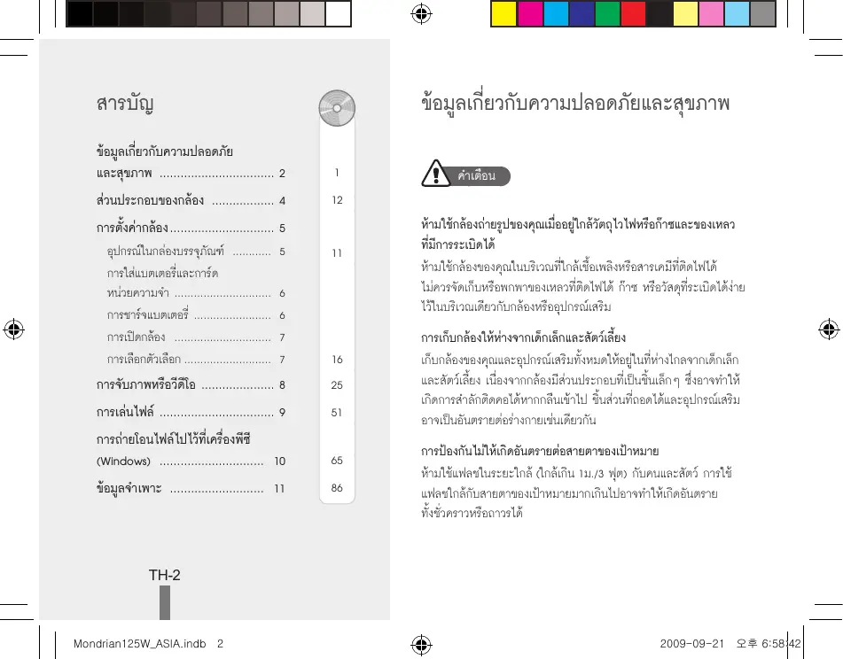 การป้องกันไม่ให้เกิดอันตรายต่อสายตาของเป้าหมาย ห้ามใช้แฟลชในระยะใกล้ (ใกล้เกิน 1ม./3 ฟุต) กับคนและสัตว์ การใช้ แฟลชใกล้กับสายตาของเป้าหมายมากเกินไปอาจทำให้เกิดอันตราย ทั้งชั่วคราวหรือถาวรได้ TH-2 Mondrian125W_ASIA.indb 2 2009-09-21 오후 6:58:42 การจัดการและกำจัดแบตเตอรี่และเครื่องชาร์จด้วยความเอาใจใส่