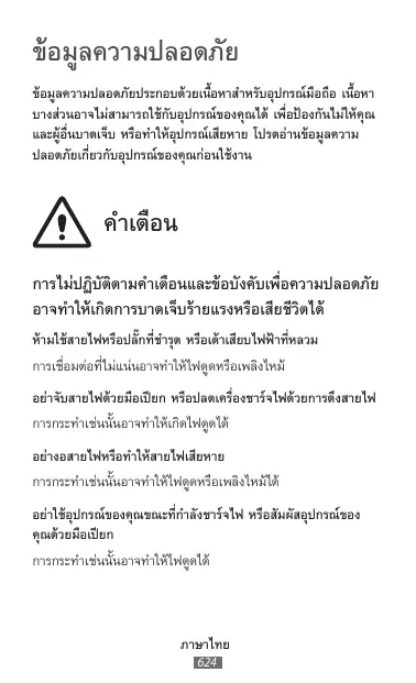 การไม่ปฏิบัติตามคำเตือนและข้อบังคับเพื่อความปลอดภัย อาจทำให้เกิดการบาดเจ็บร้ายแรงหรือเสียชีวิตได้ ห้ามใช้สายไฟหรือปลั๊กที่ชำรุด หรือเต้าเสียบไฟฟ้าที่หลวม การเชื่อมต่อที่ไม่แน่นอาจทำให้ไฟดูดหรือเพลิงไหม้ อย่าจับสายไฟด้วยมือเปียก หรือปลดเครื่องชาร์จไฟด้วยการดึงสายไฟ การกระทำเช่นนั้นอาจทำให้เกิดไฟดูดได้ อย่างอสายไฟหรือทำให้สายไฟเสียหาย การกระทำเช่นนั้นอาจทำให้ไฟดูดหรือเพลิงไหม้ได้ อย่าใช้อุปกรณ์ของคุณขณะที่กำลังชาร์จไฟ หรือสัมผัสอุปกรณ์ของ คุณด้วยมือเปียก การกระทำเช่นนั้นอาจทำให้ไฟดูดได้