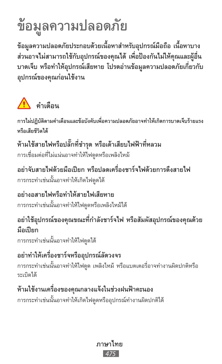 การใช้งานแบตเตอรี่หรือเครื่องชาร์จที่จำ� หน่ายทัว่ ไปอาจท�ำให้อายุการใช้งานของ อุปกรณ์สั้นลง หรืออาจท�ำให้อุปกรณ์ท�ำงานผิดปกติ และยังอาจท�ำให้เกิดเพลิงไหม้ หรือท�ำให้แบตเตอรี่ระเบิดได้ โปรดใช้เฉพาะแบตเตอรี่และเครื่องชาร์จที่ออกแบบมาโดยเฉพาะส�ำหรับอุปกรณ์ ของคุณและได้รับการรับรองโดยซัมซุง แบตเตอรี่หรือเครื่องชาร์จที่เข้ากันไม่ ได้ อาจท�ำให้เกิดการบาดเจ็บร้ายแรงหรือเกิดความเสียหายต่ออุปกรณ์ของคุณ ซัมซุงไม่ขอรับผิดชอบต่อความปลอดภัยของผู้ใช้ขณะใช้งานอุปกรณ์เสริมหรืออุป กรณ์ใดๆ ที่ไม่ได้รับอนุญาตจากซัมซุง