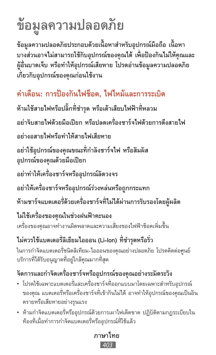 ข้อมู ลความปลอดภั ย ข้อมู ลความปลอดภั ยประกอบด้วยเนื้ อหาสำหรั บอุ ปกรณ์มือถือ เนื้ อหา บางส่วนอาจไม่สามารถใช้กับอุ ปกรณ์ของคุ ณได้ เพื่ อป้องกั นไม่ให้คุณและ ผู ้อื่นบาดเจ็บ หรือทำให้อุปกรณ์เสียหาย โปรดอ่านข้อมู ลความปลอดภั ย เกี่ ยวกั บอุ ปกรณ์ของคุ ณก่อนใช้งาน คำเตือน: การป้องกั นไฟช็อต, ไฟไหม้และการระเบิด ห้ามใช้สายไฟหรือปลั๊ กที่ ชำรุ ด หรือเต้าเสียบไฟฟ้าที่หลวม อย่าจั บสายไฟด้วยมือเปียก หรือปลดเครื่องชาร์จไฟด้วยการดึงสายไฟ อย่างอสายไฟหรือทำให้สายไฟเสียหาย อย่าใช้อุปกรณ์ของคุ ณขณะที่กำลั งชาร์จไฟ หรือสั มผั ส อุ ปกรณ์ของคุ ณด้วยมือเปียก อย่าทำให้เครื่ องชาร์จหรืออุ ปกรณ์ลัดวงจร อย่าให้เครื่ องชาร์จหรืออุ ปกรณ์ร่วงหล่นหรือถู กกระแทก ห้ามชาร์จแบตเตอรี่ ด้วยเครื่องชาร์จที่ไม่ได้ผ่านการรั บรองโดยผู ้ผลิต ไม่ใช้เครื่ องของคุ ณในช่วงฝนฟ้าคะนอง เครื่ องของคุ ณอาจทำงานผิดพลาดและความเสี่ ยงของไฟฟ้าช็อตเพิ ่มขึ้น ไม่ควรใช้แบตเตอรี่ ลเิ ธียมไอออน (Li-Ion) ที่ชำรุ ดหรือรั ่ว ในการกำจั ดแบตเตอรี่ ชนิดลิเทียม-ไอออนของคุ ณอย่างปลอดภั ย โปรดติดต่อศูนย์ บริการที่ ได้รับอนุ ญาตที่ อยู่ใกล้คุณมากที่ สุ ด จั ดการและกำจั ดเครื่ องชาร์จหรืออุ ปกรณ์ของคุ ณอย่างระมั ดระวั ง