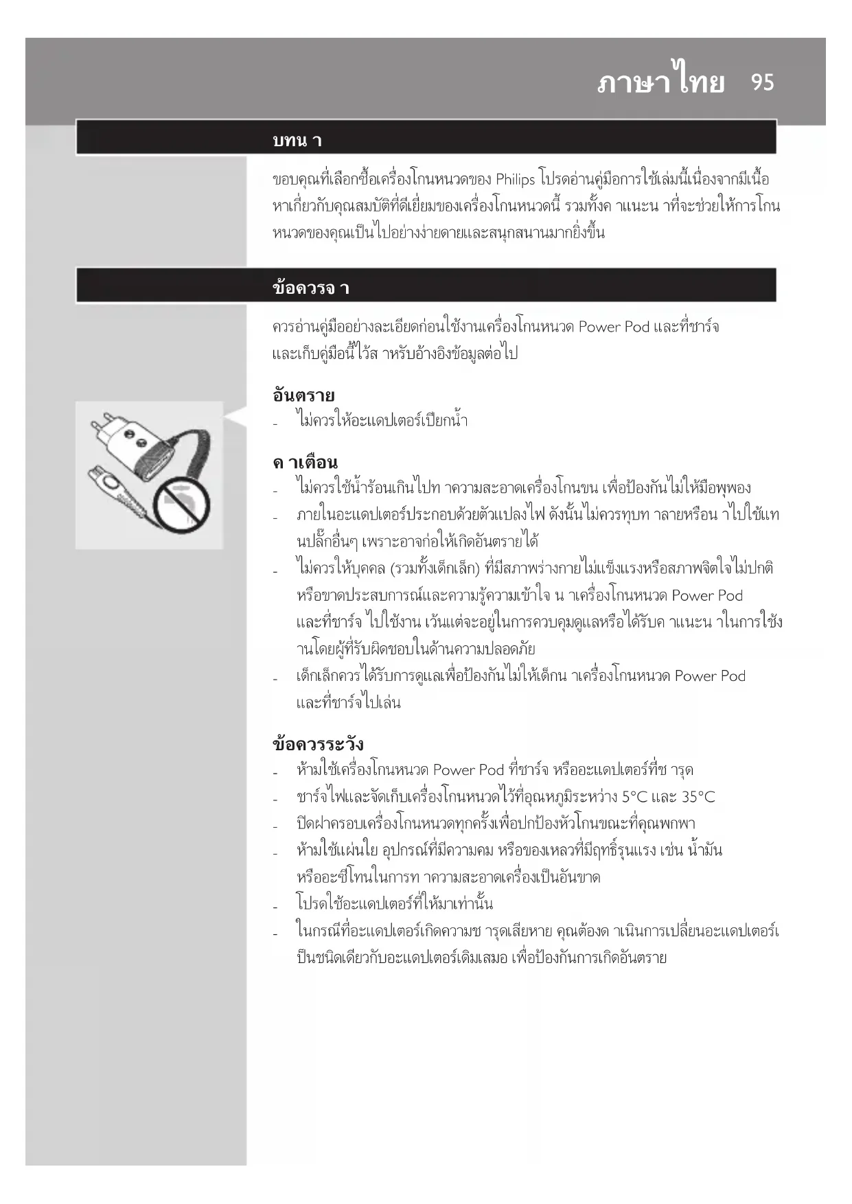 หามใชเครื่องโกนหนวด Power Pod ที่ชารจ หรืออะแดปเตอรที่ชำรุด